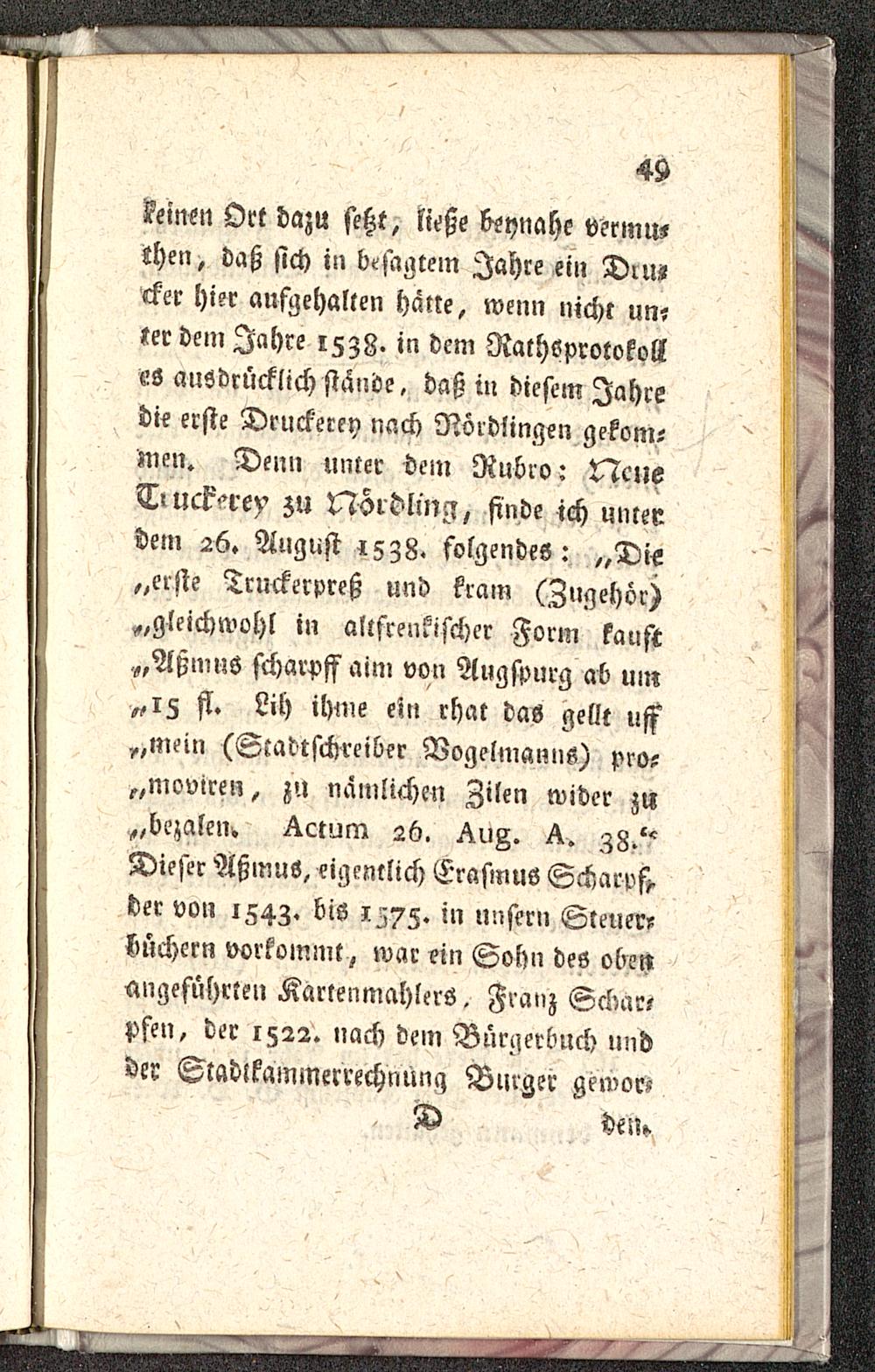 keinen Ort dazu seht, ließe beynahe vermu«then, daß sich in besagtem Jahre ein Dniscker hier aufgehalten hätte, wenn nicht un»»er dem Jahre izzZ. in dem Rathsprotokoll«s ausdrücklich stände, daß in diesem Jahredie erste Druckerey nach Nördiingen gekom-men. Denn unter dem Rubro: NeueTiuck-'rey zu Nördlmsx, finde ich unter,dem 26. Angust 15Z8. folgendes: „Die„erste Truckerpreß und kram (Zngehör)„gleichwohl in altfrenkischer Form kauft„AßmuS scharpff aim von Augfpurg ab um„15 fl. Lih ihme ein rhat das gellt uff„mein (Stadtschreiber Vogelmanns) pro-„moviren, zu nämlichen Zilen wider zu„bezalem ^ctum 26. ^uZ. ^. zZ.^Dieser AßmuS, eigentlich Erasmus ScKarpst.der von 154z. bis 1575. in unsern Steuer?büchern vorkommt, war ein Sohn des ob-mangeführten Kartenmahlers. Franz Sckar?pfen, der 1522. nach dem Bürgerbuch undder Sladikammerrechnung Bürger gemors- D tzen.