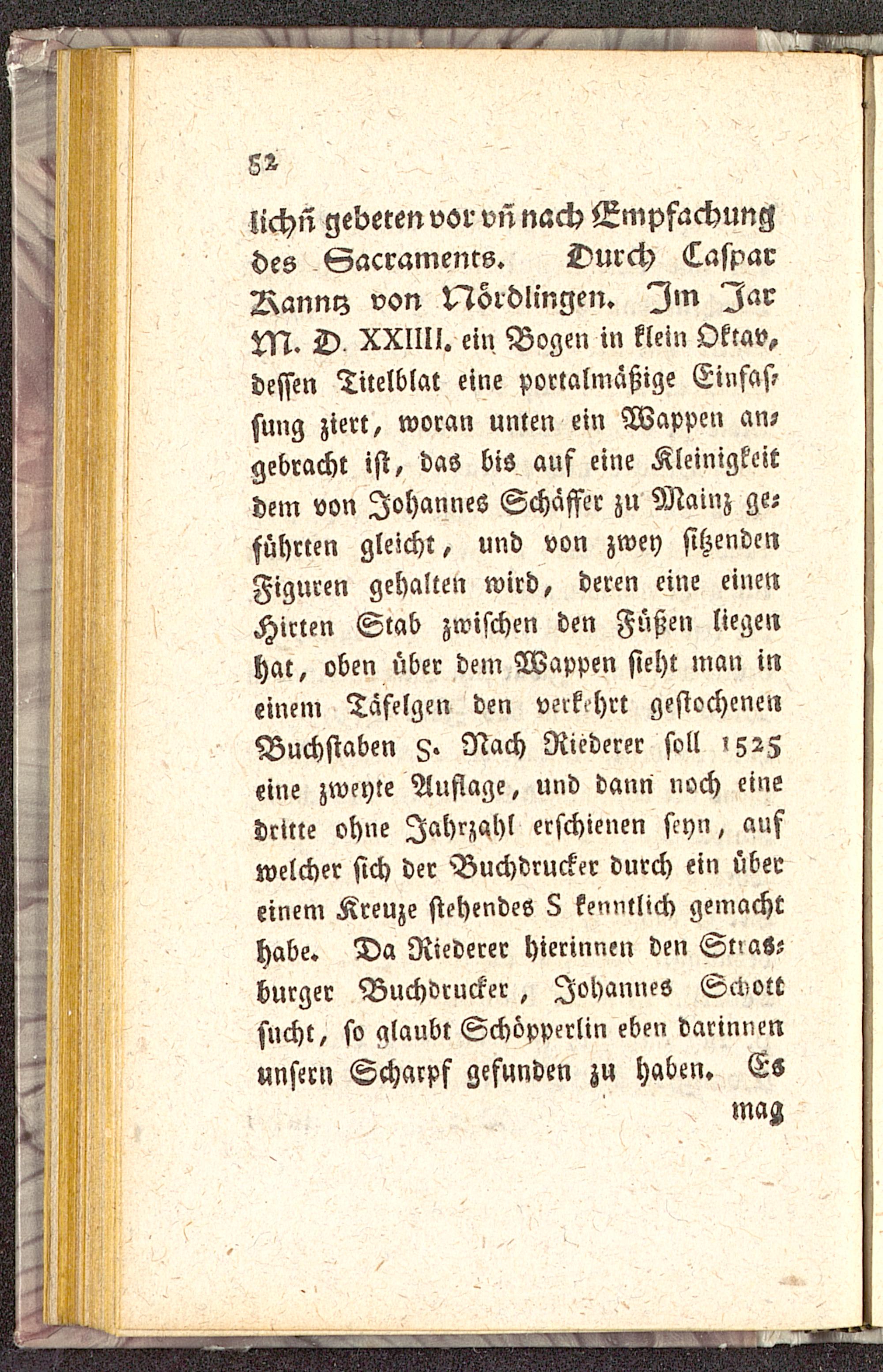 iichn gebeten vor vn nach Empfachungdes Gacramenrs. Durch CasparRanny von LTZordlingen. ^Zm IarM. D XXIIll. ein Bogen in klein Oktav,dessen Titelblat eine portalmäßige Einfas?sung ziert, woran unten ein Wappen an-gebracht ist, das bis auf eine Kleinigkeitdem von Johannes Schaffet zu Mainz ge-führten gleicht, und von zwey sitzendenFiguren gehalten wird, deren eine einenHirten Stab zwischen den Füßen liegenhat, oben über dem Wappen sieht man ineinem Tafelgen den verk.hrt gestochenenBuchstaben F. Nach Niederer soll '525eine zweyte Auflage, und dann noch einedritte ohne Iahrzcchl erschienen scyn, aufwelcher sich der Buchdrucker durch ein übereinem Kreuze stehendes 8 kenntlich gemachthabe. Da Niederer hierinnen den SliaS-burger Buchdrucker, Johannes Sctiottsucht, so glaubt Schöpperlin eben darinnenunsern Scharpf gefunden zu haben. Es