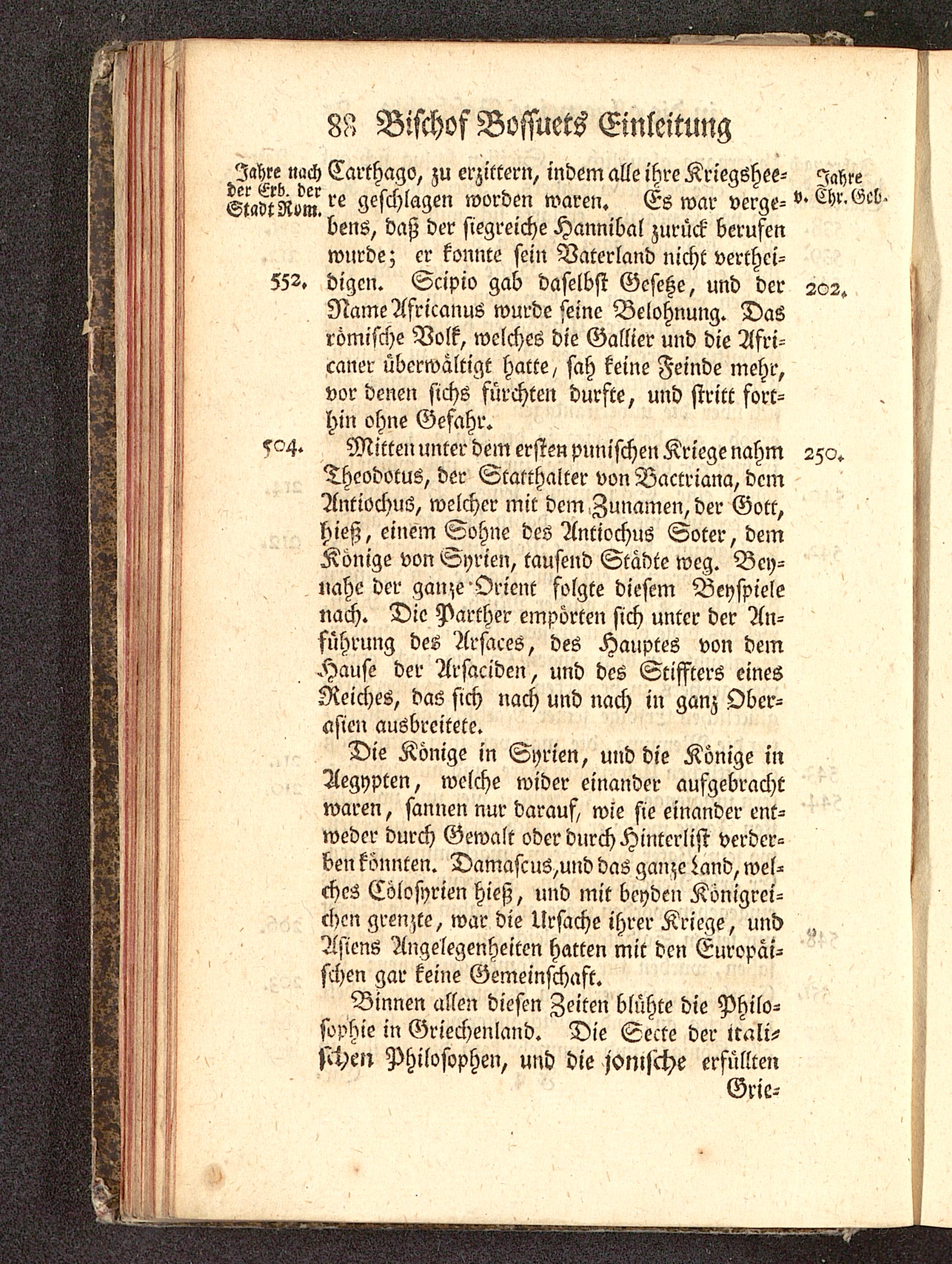 Jahre »ach Carthago, zu erzittern, indem alle ihre Kriegshee- JahreStadtRvm. ^ geschlagen worden waren. Es war verge- v> Chr.Gcb.' bens, daß der siegreiche Hannibal zurück berufenwurde; er konnte sein Vaterland nicht verthei-552. digcn. Scipio gab daselbst Gesetze, und der 202.NameAfricanus wurde seine Belohnung. Dasrömische Volk, welches die Gallier und die Afri-caner überwältigt hatte/ sah keine Feinde mehr,vor denen sichs fürchten durfte, und stritt fort-hin ohne Gefahr.504. Mitten unter dem ersten punischen Kriege nahm 250.Thcodotus, der Statthalter von Vactriana, demAntiochus, welcher mit dem Zunamen, der Gott ,hieß, einem Sohne des Antiochus Soter, demKönige von Syrien , tausend Städte weg. Bey-nahe der gan^e Orient folgte diesem Beyspielenach. Die Parther empörten sich unter der An-führung des Arsaces, des Hauptes von demHause der Arsacidcn, und des Stiffters einesReiches, das sich nach und nach in ganz Ober-asicn ausbreitete.