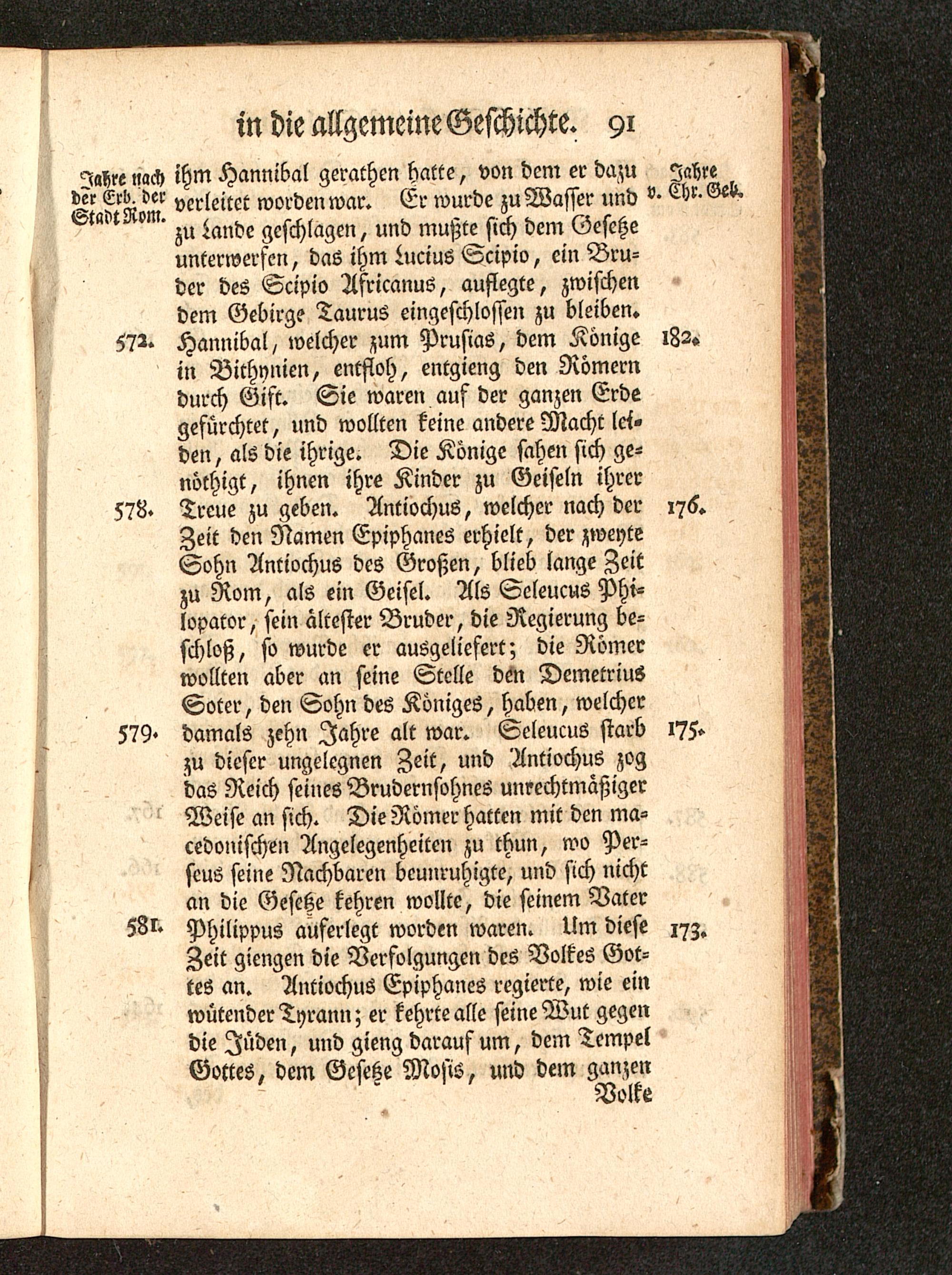 578. Treue zu geben. AntiochuS, welcher nach der 176.Zeit den Namen Epiphanes erhielt, der zweyteSohn Antiochuö des Großen, blieb lange Zeitzu Rom , als ein Geisel. Als ScleucuS Phi-lopator, sein ältester Bruder, die Negierung be-schloß, so wurde er ausgeliefert; die Römerwollten aber an seine Stelle den DemetriuSSoter, den Sohn des Königes, haben, welcher