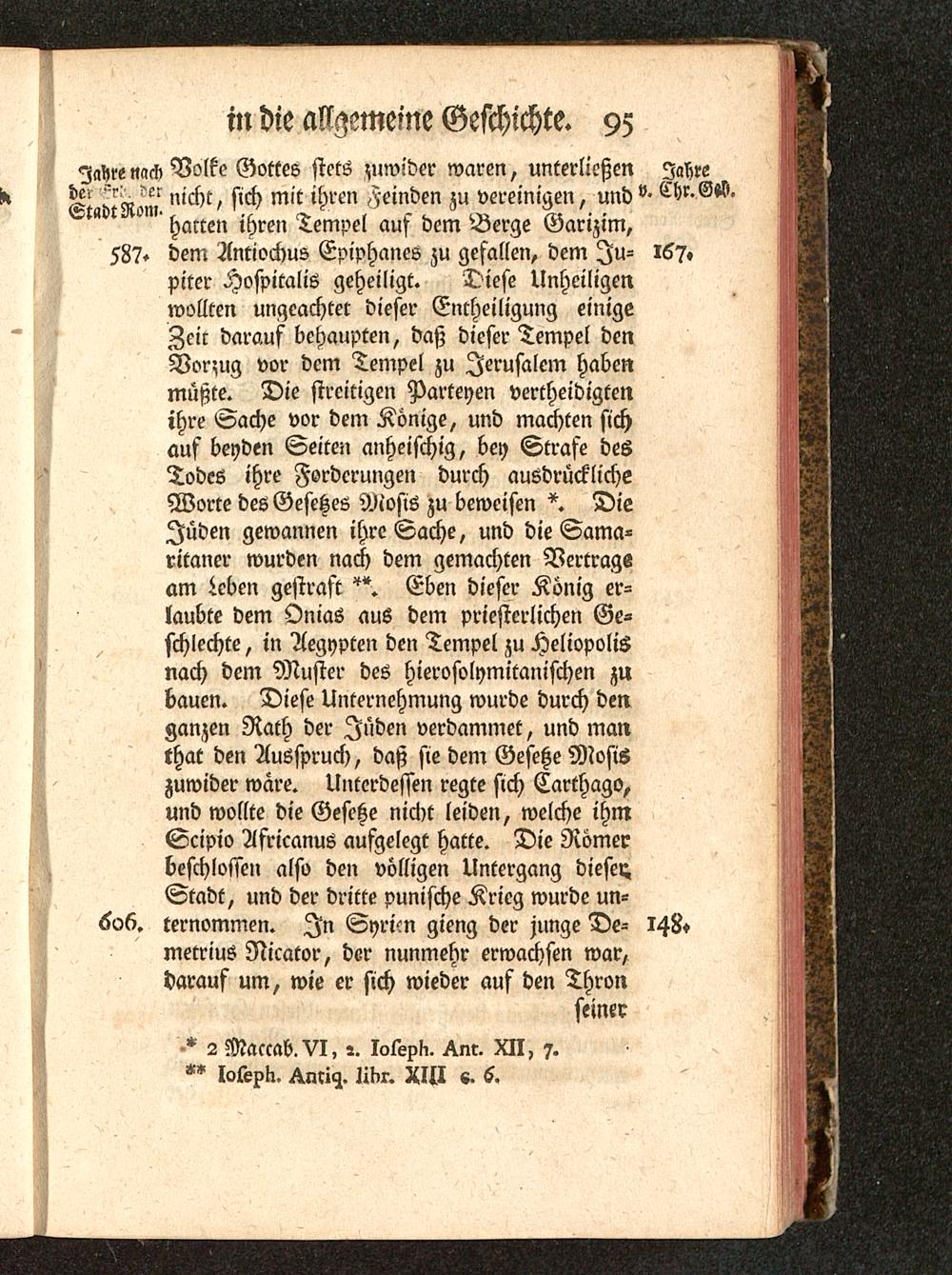"" " hatten ihren Tempel auf dem Berge Garizim,58?» dem Antiochus Epiphanes zu gefallen, dem Ju- 167,virer Hospitaliö geheiligt. Diese Unheiligenwollten ungeachtet dieser EntHeiligung einigeZeit darauf behaupten, daß dieser Tempel denVorzug vor dem Tempel zu Jerusalem habenmüßte. Die streitigen Parteyen vertheidigtenihre Sache vor dem Könige, und machten sichauf beyden Seiten anheischig, bey Strafe desTodes ihre Forderungen durch ausdrücklicheWorte des Gesetzes Mosis zu beweisen DieJuden gewannen ihre Sache, und dieSama-ritaner wurden nach dem gemachten Vertragsam Leben gestraft Eben dieser König er-laubte dem Onias aus dem priesterlichen Ge-schlechte , in Aegypten den Tempel zu Heliopolisnach dem Muster des hierosolymitanischen zubauen. Diese Unternehmung wurde durch denganzen Rath der Juden verdammet, und manthat den Ausspruch, daß sie dem Gesetze Mosiszuwider wäre. Unterdessen regte sich Carthago,und wollte die Gesetze nicht leiden, welche ihmScipio Africanus aufgelegt hatte. Die Römerbeschlossen also den völligen Untergang diese»;Stadt, und der dritte punische Krieg wurde un-60K. ternommen. In Syrien gieng der junge De- 148»metrius Nicator, der nunmehr erwachsen war,darauf um, wie er sich wieder auf den Thron