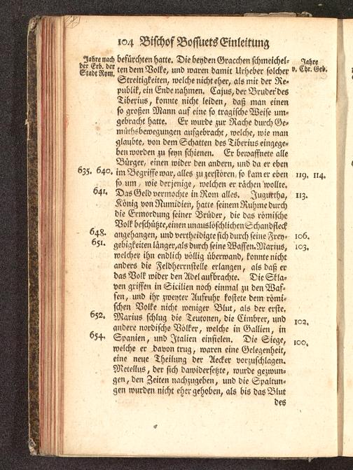 Jahre nach befürchten hatte. Die beyden Gracchen schmeichel- MrsSmt Rm ten dem Volke, und waren damit Urheber solcher Chr. Gel..' Streitigkeiten, welche nicht eher, als mir der Re-publik , ein Ende nahmen. Cajus, der Bruder desTiberius, konnte nicht leiden, daß man einenso großen Mann auf eine so tragische Weise um-gebracht hatte. Er wurde zur Rache durch Ge-müthsbewegungen aufgebracht, welche, wie manglaubte, von dem Schatten des Tiberius eingege-ben morden zu seyn schienen. Er bewaffnete alleBürger/ einen wider den andern, und da er eben6Z5. 640. im Begriffe war, alles zu zerstören-so kam er eben 119. 114.so um / wie derjenige, welchen er rächen wollte.641« Das Geld vermochte in Rom alles. Iugurtha , uz.König von Numidien , hatte seinem Ruhme durchdie Ermordung seiner Brüi)er, die das römischeVolk beschüHte,einen unauslöschlichcnSchandfleck64^ angehangen, und vertheidigte sich durch seine Frey- 106.651. gebigkeiton länger,als durch seine Waffen.Marius, ioz.welcher ihn endlich völlig überwand, konnte nichtanders die Feldherrnstelle erlangen, als daß erdas Volk wider den Adel aufbrachte. Die Skla-ven griffen in Sizilien noch einmal zu den Waf-fen , und ihr zweyter Aufruhr kostete dem römi-schen Volke nicht weniger Blut, als der erste.652» Marius schlug die Teutonen, die Cimbrer, und 102.
