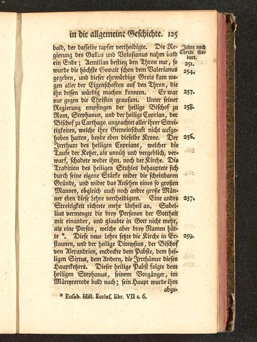 bald, der dasselbe tapfer vertheidigte. Die Ne- Jahre nachgierung des Gallus und Volusianus nahm bald ^A.^ein Ende; Aemilian bestieg den Thron nur, so 251.wurde die höchste Gewalt schon dem Valerianusgegeben, und dieser ehrwürdige Greis kam we-gen aller der Eigenschaften auf den Thron, dieihn dessen würdig machen konnten. Er war 257.nur gegen die Christen grausam. Unter seinerRegierung empfingen der heilige Bischof zu 258»Rom, Stephanus, und der heilige Cyprian , derBischof zu Carthago, ungeachtet aller ihrer Strei-tigkeiten, welche ihre Gemeinschaft nicht aufge-hoben hatten, beyde eben dieselbe Krone. Der 256.Irrthum des heiligen Cyprian6, welcher dieTaufe der Ketzer, als unnütz und vergeblich, ver-warf, schadete weder ihm, noch der Kirche. DlsTradition des heiligen Stuhles behauptete sichdurch seine eigene Stärke wider die scheinbarenGründe, und wider das Ansehen eines so großenMannes, obgleich auch noch andre große Män-ner eben diese Lehre vertheidigten. Eine andre 257«Streitigkeit richtete mehr Unheil an. Sabel-lius vermengte die drey Personen der Gottheitmit einander, und glaubte in Gott nicht mehr,als eine Person, welche aber drey Namen hät-te Diese neue Lehre setzte die Kirche in Er- 259.staunen, und der heilige Dionysius, der Bischofvon Alerandrien, entdeckte dem Pabste, dem hei»ligen Sirtus, dem Andern, die Irrthümer diesesHauptketzers. Dieser heilige Pabst folgte demheiligen Stephanus, seinem Vorgänger, imMärtyrertode bald nach; sein Haupt wurde ihm