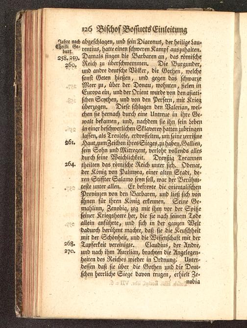 Jahre nach abgeschlagen, und sein Diaconus, der heilige Lau-^burt.^ ^entius, hatte einen schweren Kampf auszuhalten.258.259. Damals fingen die Barbaren an, das römische260, Reich zu überschwemmen. Die Burgunder,und andre deutsche Völker, die Gorhen, welchesonst Geten hießen, und gegen das schwarzeMeer zu, über der Donau , wohnten, sielen inEuropa eilt, und der Orient wurde von den asiati-schen Scythen, und von den Persern, mit Kriegüberzogen. Diese schlugen den Valerian, wel-chen sie hernach durch eine Untreue in ihre Ge-walt bekamen, und, nachdem sie ihn sein Lebenin eiucr beschwerlichen Sklaverey hatten zubringenlassen, als Treulose, erdrosselten, um seine zerrißnev6i. Haut,zumZeichen ihres Sieges,zu habey.Gallien ,sein Sohn und Mitrcgent, vcrlohr vollends allesdurch seine Weichlichkeit. Dreyßig Tyrannen264. Heilten das römische Reich unter sich. Odenat,der König von Palmyra , einer alten Stadt, de-ren Stiffter Salamo seyn soll, war der Berühm-teste unter allen. Er befreyte die orientalischenProvinzen von den Barbaren, und ließ sich vonjhnen für ihren König erkennen. Seine Ge-mahlinn, Zenobia , zog mit ihm vor der Spißeseiner Kriegsheere her, die sie nach seinem Tode^ allein anführte, und sich in der ganzen Wettdadurch berühmt machte, daß sie die Keuschheitmir der Schönheit, und die Wissenschaft mit der268. Tapferkeit vereinigte. Claudius, d.er Andre,270» und nach ihm Aurelian , brachten die Angelegen-heiten des Reiches wieder in Ordnung. Unter-dessen daß sie über die Gothen und die Deut-schen herrliche Siege davon trugen, erhielt Ze-