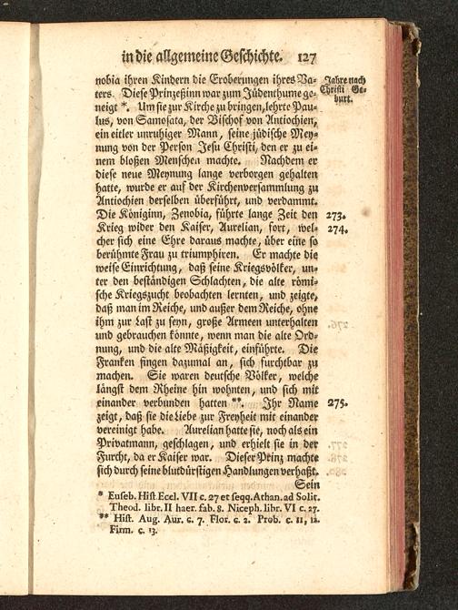 twbia ihren Kindern die Eroberungen ihresVa- Ichrenachterö. Diese Prinzessinn war zum Jüdenthume ge-neigt 5. UmsiezurKirchezubringen,lehrtePau-lus, von Samosata, der Bischof von Antiochien ,ein eitler unruhiger Mann, seine jüdische Mey-nung von der Person Jesu Christi / den er zu ei-nem bloßen Menschen machte. Nachdem erdiese neue Meynung lange verborgen gehaltenhatte, wurde er auf der Kirchenversammlung zuAntiochien derselben überführt, und verdammt.Die Königinn, Zenobia, führte lange Zeit den 27z.Krieg wider den Kaiser, Aurelian, fort, wel- 274«chcr sich eine Ehre daraus machte, über eine soberühmte Frau zu triumphiren. Er machte dieweise Einrichtung, daß seine Kriegsvölker, un-ter den beständigen Schlachten, die alte römi-sche Kriegszucht beobachten lernten, und zeigte,daß man im Reiche, und außer dem Reiche, ohneihm zur Last zu seyn, große Armeen unterhaltenund gebrauchen könnte, wenn man die alte Ord-nung, und die alte Mäßigkeit, einführte. DieFranken fingen dazumal an, sich furchtbar zumachen. Sie waren deutsche Völker, welchelängst dem Rheine hin wohnten, und sich miteinander verbunden hatten **. Ihr Name 275.zeigt, daß sie die Liebe zur Freyheit mit einandervereinigt habe. Aurelian hatte sie, noch als einPrivatmann, geschlagen, und erhielt sie in derFurcht, da er Kaiser war. Dieser Prinz machtesich durch seine blutdürstigen Handlungen verhaßt.