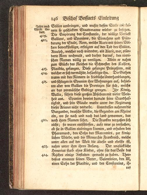 Jahre nach Stilico umbringen, und wußte dessen Stelle mit kel--Evristi^Ge- ^ geschickten Staatsmanne wieder zu besetzen.409. Die Empörung^des Constantin, der völlige VerlustGalliens, und Spaniens , die Einnahme und Plün-derung der Stadt, Rom, welche Alaric mit seinen Völ-kern bewerkstelligte, erfolgten auf den Tod des Stilico.Ataulph, welcher noch wütender, als Alaric, war, plün-derte Rom nochmals, und dachte darauf, den römi-schen Namen völlig zu vertilgen. Allein er nahmzum Glücke des Reiches die Schwester des Kaisers,