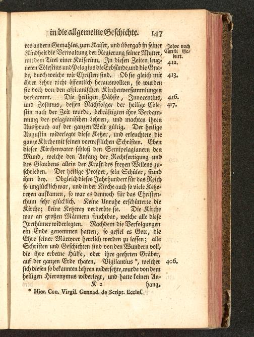 res andern Gemahles/zum Kaiser, und übergab in seiner M?e nachKindheit die Verwaltung der Regierung seiner Mutter,mit dem Titel einer Kaiserinn. In diesen Zeiten leug-nctcn Cölestius undPelagius dieErbsünde,und die Gna-de, durch welche wir Christen sind. Ob sie gleich mit 41z.ihrer Lehre nicht öffentlich herauswollten, so wurdensie doch von den afrikanischen Kirchenversammlungenverdammt. Die heiligen Päbste, Jnnocentius, 4^6.und Zosimus, dessen Nachfolger der heilige Cöle- 41?»stin nach der Zeit wurde, bekräftigten ihre Verdam-mung der pclagianischen lehren, und machten ihrenAusspruch auf der ganzen Welt gültig. Der heiligeAugustin widerlegte diese Keßer, und erleuchtete dieganze Kirche mit seinen vortrefflichen Schriften. Ebendieser Kirchenvater schloß den ^-emipelagianern denMund, welche den Anfang der Rechtfertigung unddes Glaubens allein der Kraft des freyen Willens zu-schrieben. Der heilige Prosper, sein Schüler, stundihm bey. Obgleich dieses Jahrhundert für das Reichso unglücklich war, und in der Kirche auch so viele KeHe-reyen aufkamen, so war es dennoch für das Christen-thum sehr glücklich. Keine Unruhe erschütterte dieKirche; keine Keßerey verderbte sie. Die Kirchewar an großen Mannern fruchtbar, welche alle diefeIrrthümer widerlegten. Nachdem die Verfolgungenein Ende genommen hatten, so gefiel es Gott, dieEhre seiner Märtyrer herrlich werden zu lassen; alleSchriften und Geschichten sind von den Wundern voll,die ihre erbetne Hülfe, oder ihre geehrten Gräber,auf der ganzen Erde thaten. Vigilantius *, welcher 406»sich diesen so bekannten Lehren widerseßte,wurde von demheiligen Hieronymus widerlegt, und hatte keinen An-