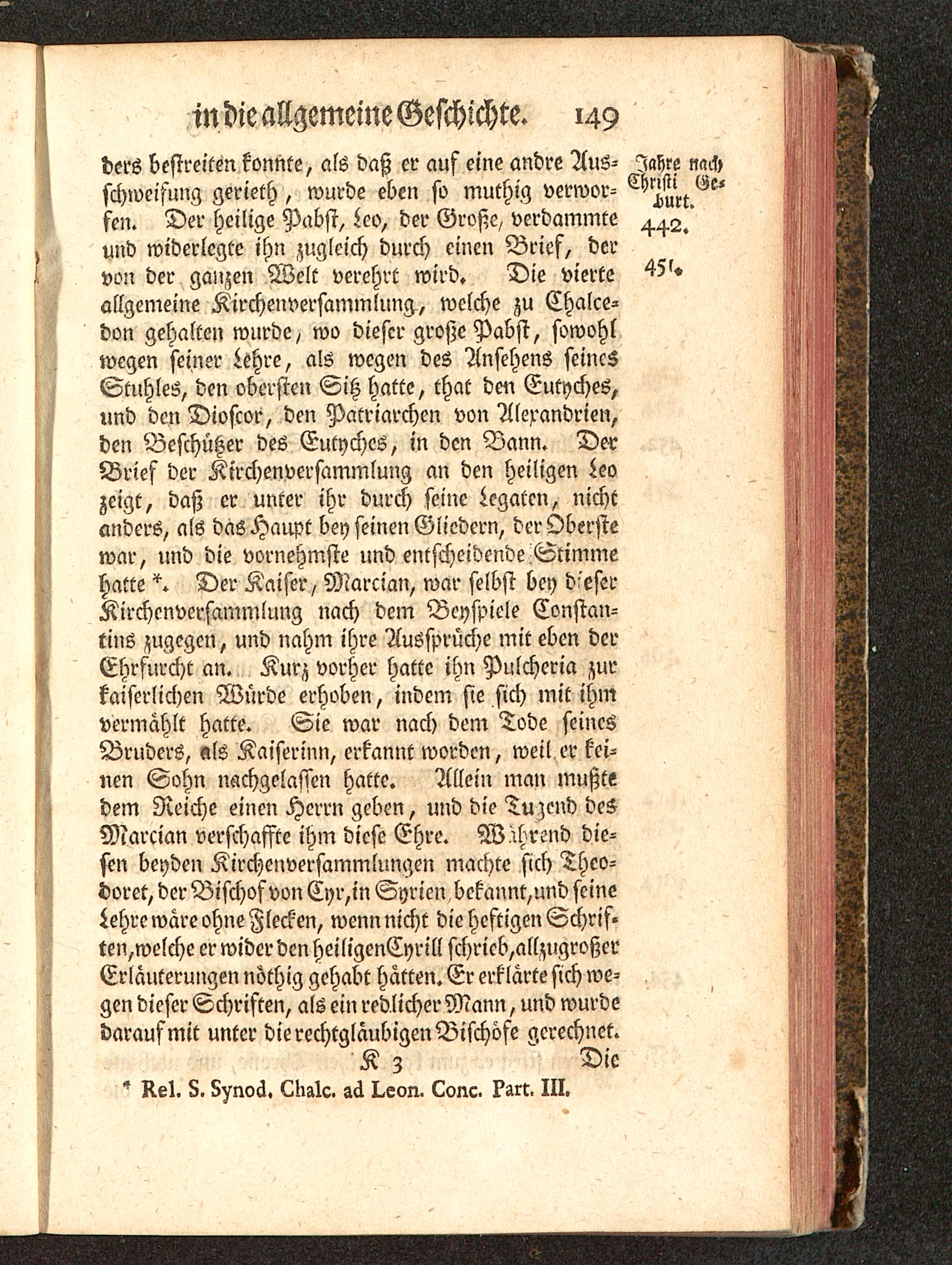 ders bestreiken konnte, als daß er auf eine andre Aus- Jahreschweifung gerieth, wurde eben so muthig verwor-fen. Der heilige Pabst, Leo, der Große, verdammteund widerlegte ihn zugleich durch einen Brief, dervon der ganzen Welt verehrt wird. Die vierte 45?«allgemeine Kircheiwersammlung, welche zu Chalce-don gehalten wurde, wo dieser große Pabst, sowohlwegen seiner Lehre, als wegen des Ansehens seinesStuhles, den obersten Sitz hatte, that den Eutyches,und den Dioscor, den Patriarchen von Alercmdrien,den Beschützer des Eutyches , in den Bann. DerBrief der Kirchenversammlung an den heiligen Leozeigt, daß er unter ihr durch seine Legaten, nichtanders, als das Haupt bey seinen Gliedern, der Oberstewar, und die vornehmste und entscheidende Stimmehatte Der Kaiser, Marcian , war selbst bey dieserKirchenversammlung nach dem Beyspiele Constan-tins zugegen, und nahm ihre Aussprüche mit eben derEhrfurcht an. Kurz vorher hatte ihn Pulcheria zurkaiserlichen Würde erhoben, indem sie sich mit ihmvermahlt hatte. Sie war nach dem Tode seinesBruders, als Kaiserinn, erkannt worden, weil er kei-nen Sohn nachgelassen hatte. Allein man mußtedem Reiche einen Herrn geben, und die Tuzend desMarcian verschaffte ihm diese Ehre. W Ehrend die-sen beyden Kirchenversammlungen machte sich Thco-doret, der Bischof von Cyr,in Syrien bekannr,und seineLehre wäre ohne Flecken, wenn nicht die heftigen Schrif-ten,welche er wider den heiligenCyrill schricb,allzugroßerErläuterungen nöthig gehabt hätten. Er erklärte sich we- ,gen dieser Schriften, als ein redlicher Mann, und wurdedaraufmit unter die rechtgläubigen Bischöfe gerechnet.