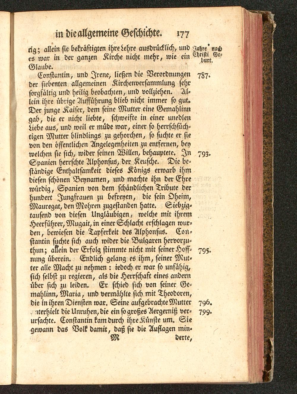 Constcmtin, und Irene, ließen die Verordnungen 787.der siebenten allgemeinen Kirchenversammlung sehrsorgfältig und heilig beobachten, und vollziehen. Al-lein ihre übrige Aufführung blieb nicht immer so gut»Der junge Kaiser, dem seine Mutter eine Gemahlinngab, die er nicht liebte, schweifte in einer unedlenLiebe aus, und weil er müde war, einer so herrschsüch-tigen Mutter blindlings zu gehorchen, so suchte er sievon den öffentlichen Angelegenheiten zu entfernen, beywelchen sie sich, wider seinen Willen, behauptete. In 79z.Spanien herrschte Alphonsus, der Keusche. Die be-ständige Enthaltsamkeit dieses Königs erwarb ihmdiesen schönen Beynamen, und machte ihn der Ehrewürdig, Spanien von dem schändlichen Tribute derhundert Jungfrauen zu befreyen, die sein Oheim,Mauregat, den Mohren zugestanden hatte. Siebzig-tausend von diesen Ungläubigen, welche mit ihremHeerführer, Mugcm, in einer Schlacht erschlagen wur-den, bewiesen die Tapferkeit des Alphonsus. Con-stantin suchte sich auch wider die Bulgaren hervorzu-thun; a?ein der Erfolg stimmte nicht mit seiner Hoff- 795.nung überein. Endlich gelang es ihm, seiner Mut-ter alle Macht zu nehmen : redoch er war so unfähig,sich selbst zu regieren, als die Herrschaft eines andernüber sich zu leiden. Er schied sich von seiner Ge-mahlinn, Maria, und vermahlte sich mit Theodoren,die in ihren Diensten war. Seine aufgebrachte Mutter 796.. iterhielt die Unruhen, die ein so großes Aergerniß ver- 799.ursachte. Constantin kam durch ihre Künste um. Siegewann das Volk damit, daß sie die Auflagen min-