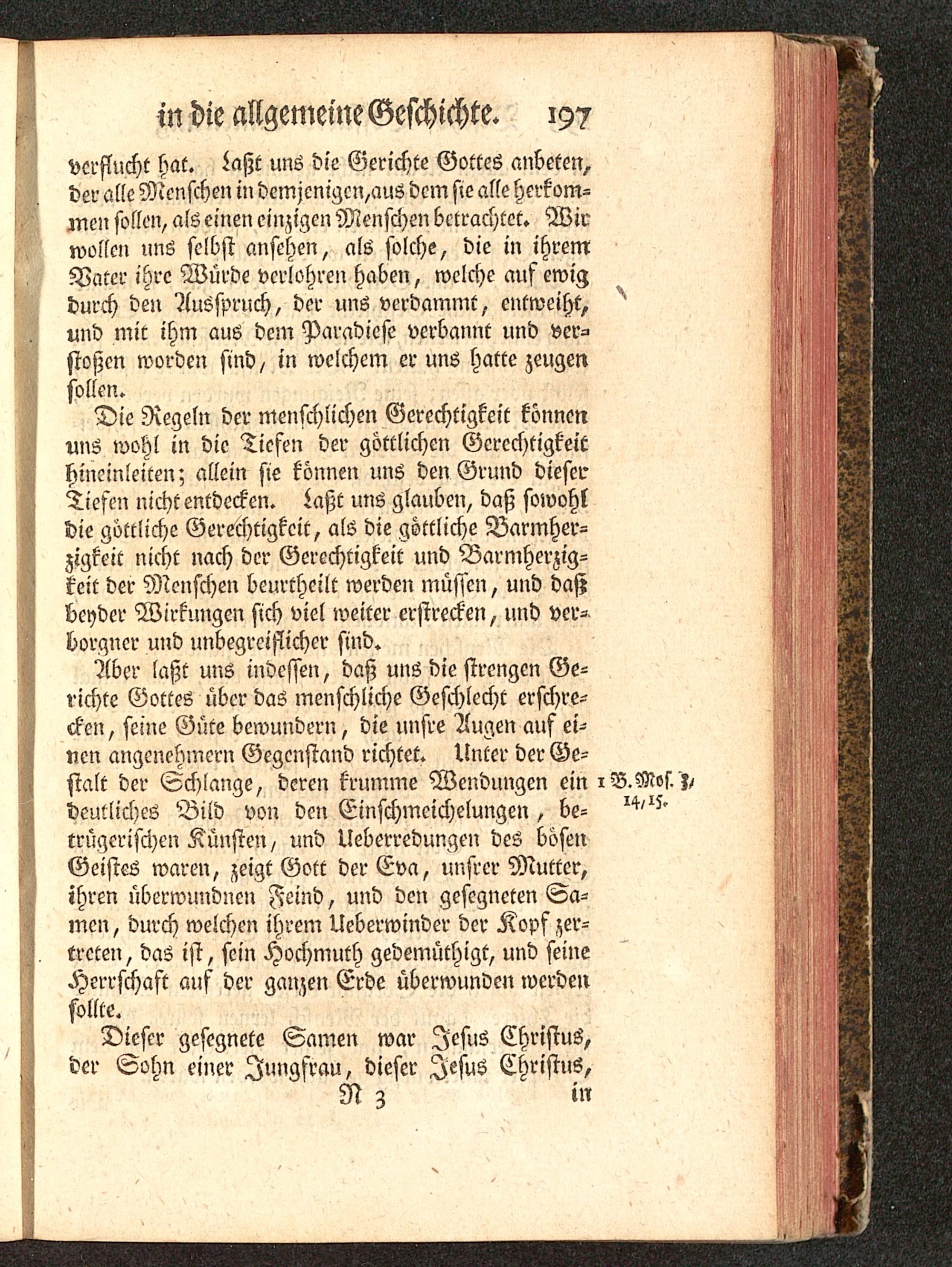 Aber laßt uns indessen, daß uns die strengen Ge-richte Gottes über das menschliche Geschlecht erschre-cken, seine Güte bewundern, die unsre Augen auf ei-nen angenehmern Gegenstand richtet. Unter der Ge-stalt der Schlange, deren krumme Wendungen ein i B.Mos. Z/deutliches Bild von den Einschmcichelungen, be-trügerischen Künsten, und Ueberredungen des bösenGeistes waren, zeigt Gott der Eva, unsrer Mutter,ihren überwundncn Feind, und den gesegneten Sa-men , durch welchen ihrem Ueberwinder der Kopf zer-treten, das ist, sein Hochmuth gedemüthigt, und seineHerrschaft auf der ganzen Erde überwunden werdensollte.