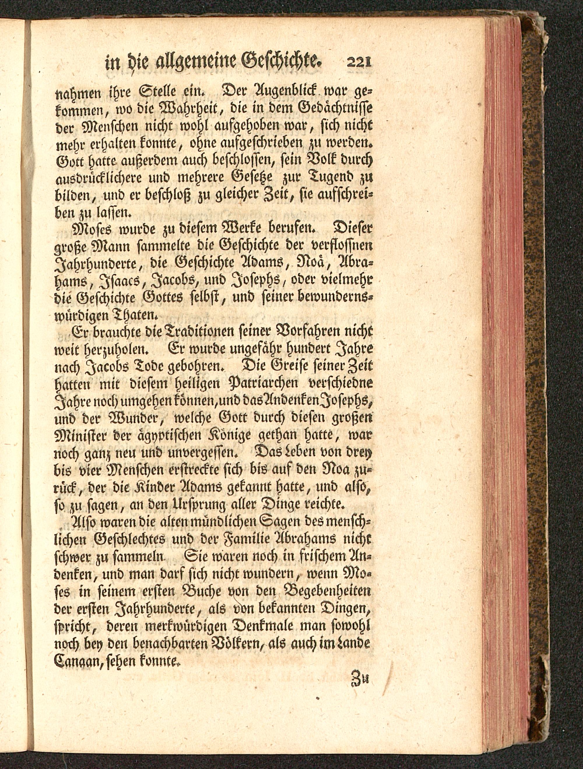 Moses wurde zu diesem Werke berufen. Diesergroße Mann sammelte die Geschichte der verflossnenJahrhunderte, die Geschichte Adams, Noa, Abra-hams , Jsaacs, Jacobs, und Josephs, oder vielmehrdie Geschichte Gottes selbst, und seiner bewunderns-würdigen Thaten.