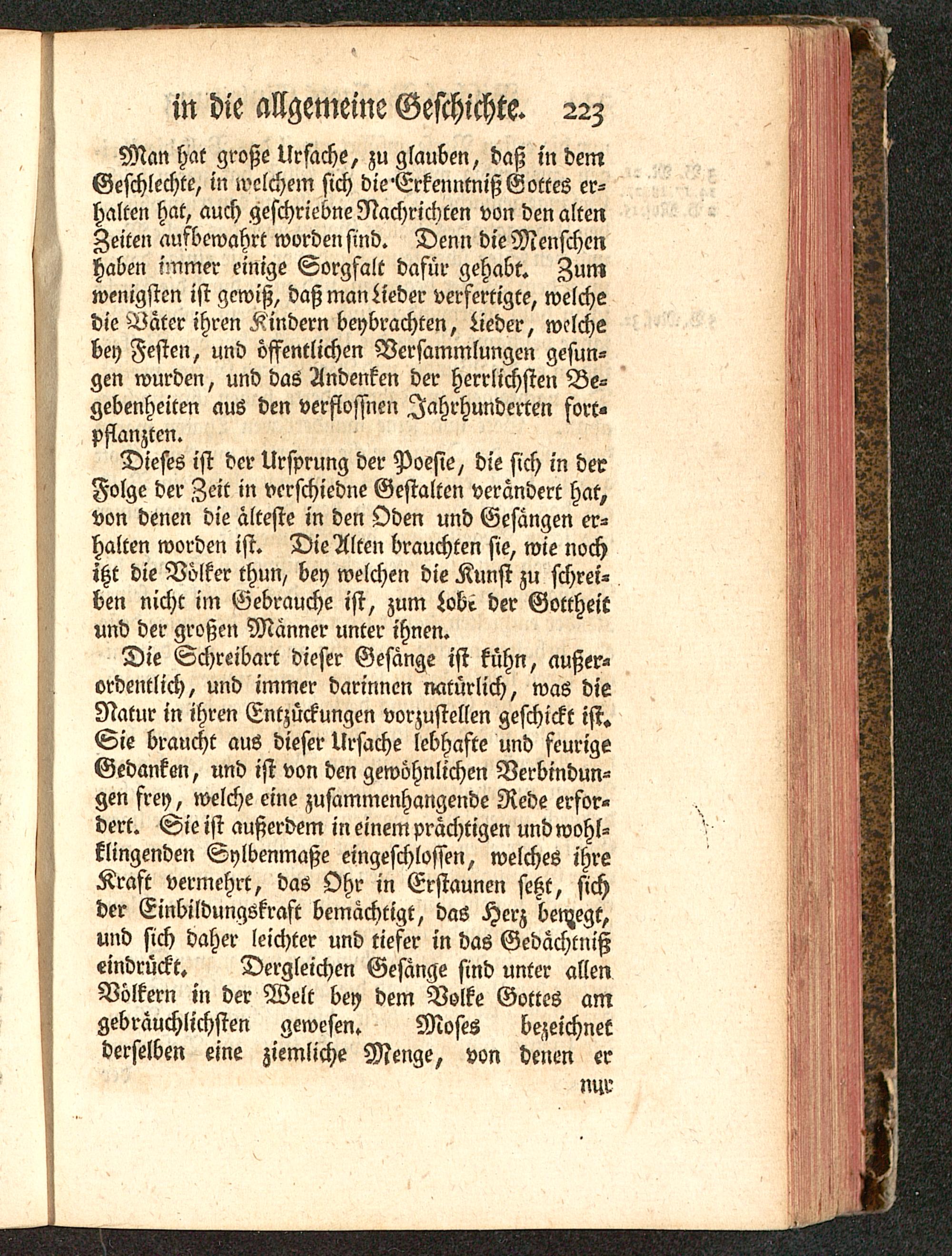 Man hat große Ursache, zu glauben, daß in demGeschlechte, in welchem sich die'Erkenntniß Gottes er-halten hat, auch geschriebne Nachrichten von den altenZeiten aufbewahrt worden sind. Denn die Menschenhaben immer einige Sorgfalt dafür gehabt. Zumwenigsten ist gewiß, daß man Lieder verfertigte, welchedie Väter ihren Kindern beybrachten, Lieder, welchebey Festen, und öffentlichen Versammlungen gesun-gen wurden, und das Andenken der herrlichsten Be-gebenheiten aus den verflossnen Jahrhunderten fort-pflanzten.