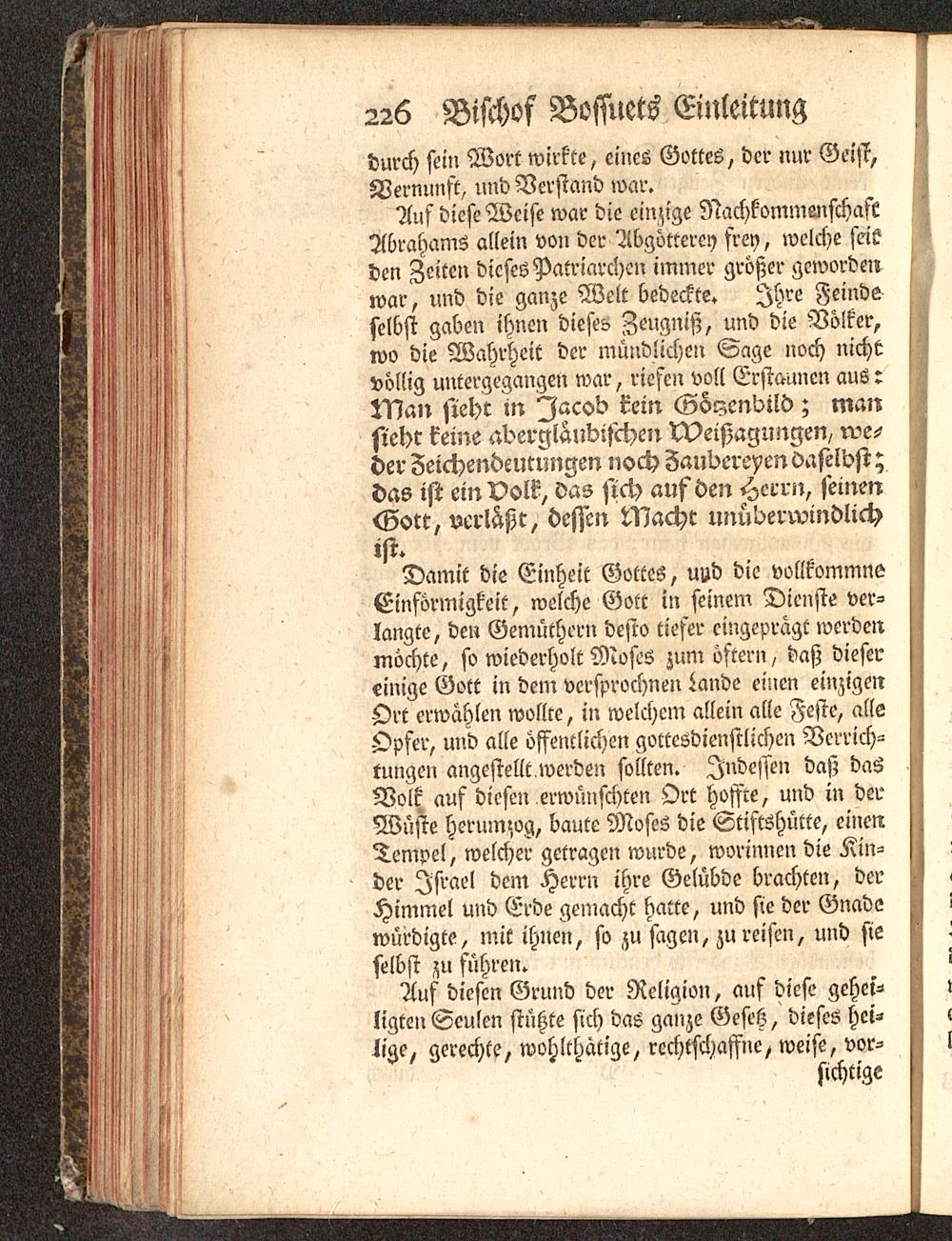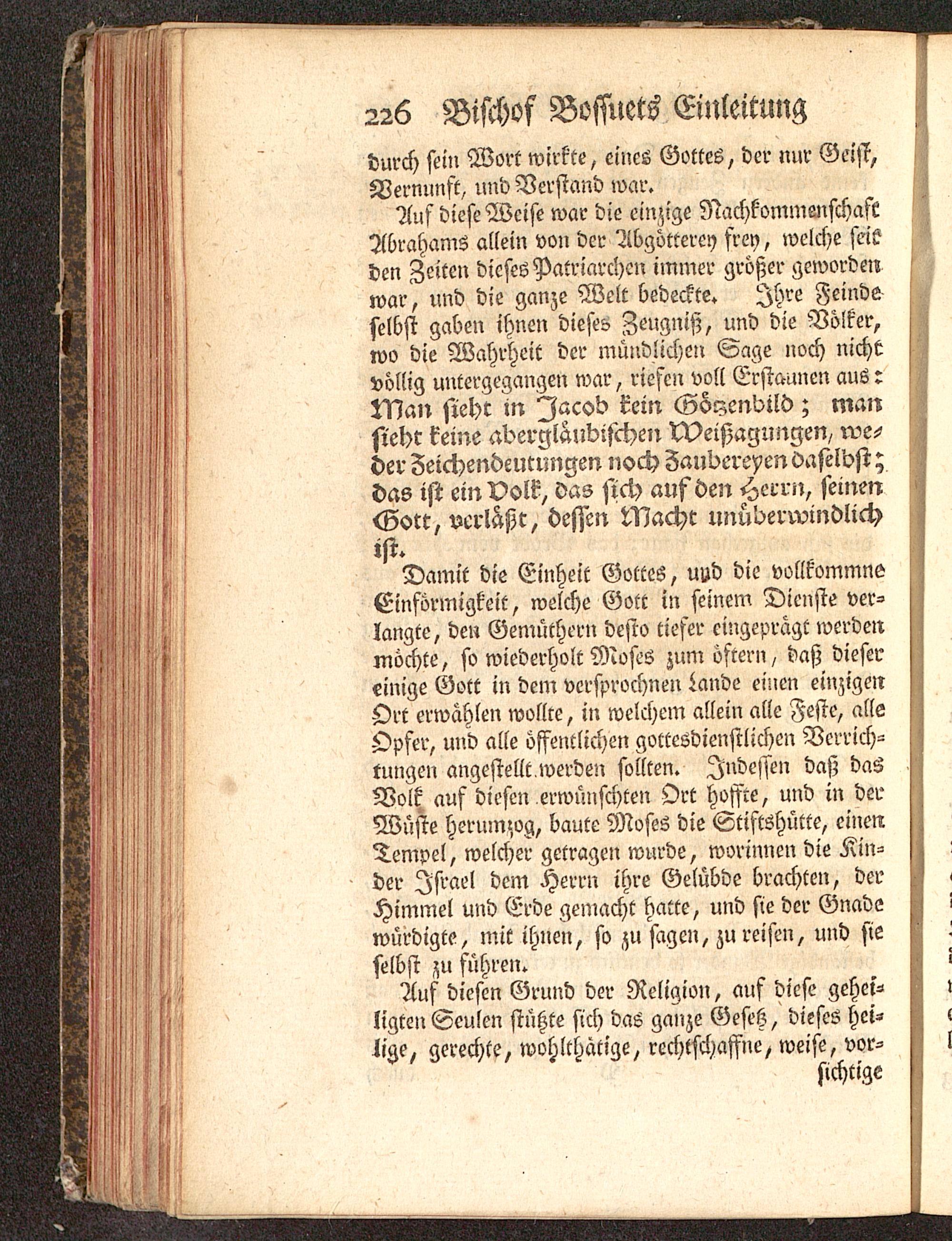 Damit die Einheit Gottes, und die vollkommnsEinförmigkeit, welche Gott in seinem Dienste ver-langte, den Gemüthern desto tiefer eingeprägt werdenmöchte, so wiederholt Mosts zum öftern, daß diesereinige Gott in dem vcrsprochnen Lande einen einzigenOrt erwählen wollte, in welchem allein alle Feste, alleOpfer, und alle öffentlichen gottesdienstlichen Verrich-tungen angestellt werden sollten. Indessen daß dasVolk, auf diesen erwünschten Ort hoffte, und in derWüste herumzog, baute Moses die Stiftshütte, einenTempel, welcher getragen wurde, worinnen die Kin-der Israel dem Herrn ihre Gelübde brachten, derHimmel und Erde gemacht hatte, und sie der Gnadewürdigte, mit ihnen, so zu sagen, zu reisen, und sieselbst zu führen.
