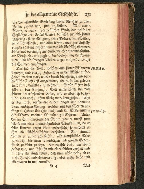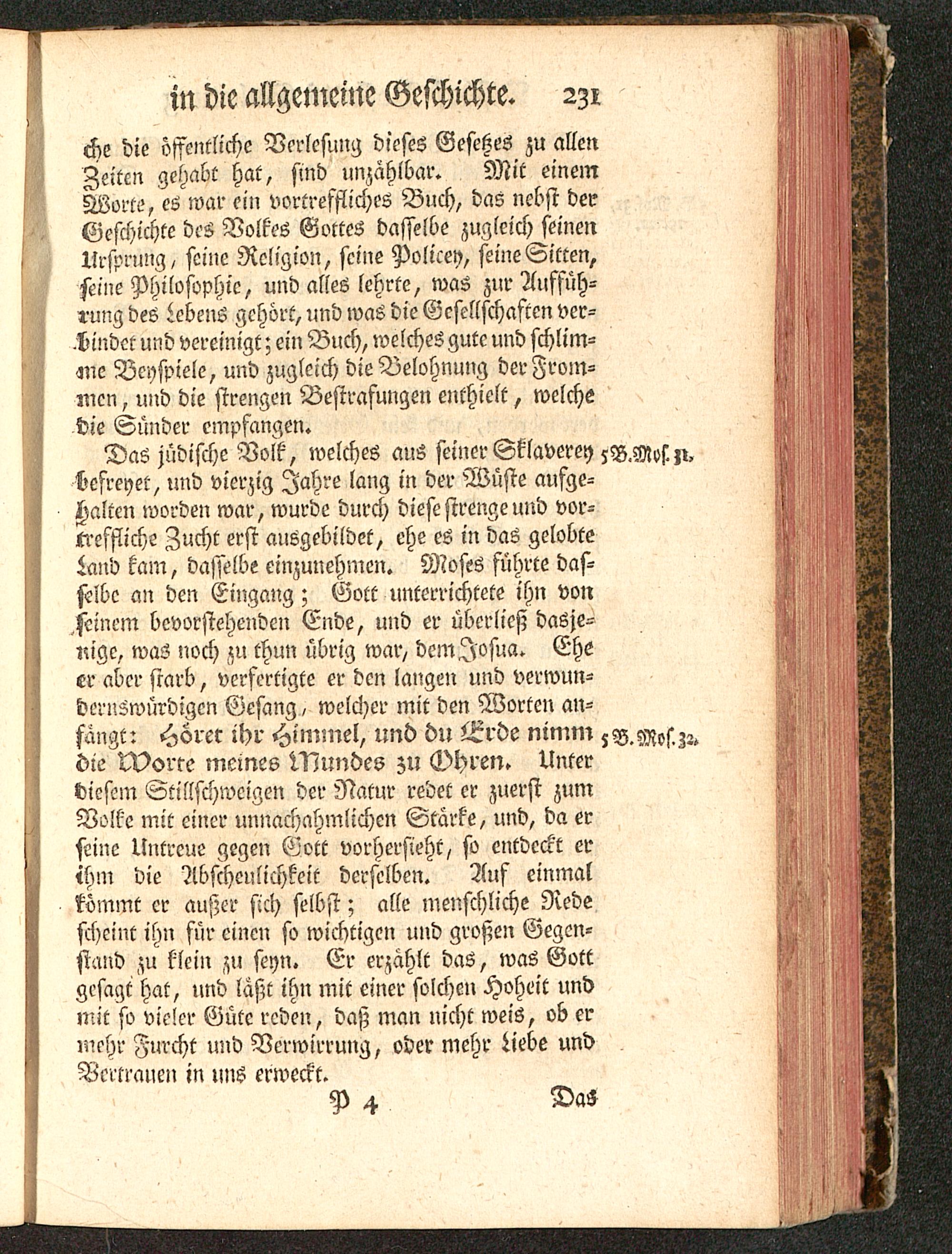 Das jüdische Volk, welches aus seiner Sklaverey;B.Mvsbefreyet, und vierzig Jahre lang in der Wüste aufge-halten worden war, wurde durch diese sirenge und vor-treffliche Zucht erst ausgebildet, ehe es in das gelobteLand kam, dasselbe einzunehmen. Moses führte das-selbe an den Eingang; Gott unterrichtete ihn vonseinem bevorstehenden Ende, und er überließ dasje-nige, was noch zu thun übrig war, demIosua. Eheer aber starb, verfertigte er den langen und verwun-dernswürdigcn Gesang, welcher mit den Worten an-fängt: Hörer ihr Himmel, und du Erde nimm zB.Mvs.z-.die tVorre meines Mundes zu Ghren. Unterdiesem Stillschweigen der Natur redet er zuerst zumVolke mit einer unnachahmlichen Starke, und, da erseine Untreue gegen Gott vorhersieht, so entdeckt er«hin die Abscheulichkeit derselben. Auf einmalkömmt er außer sich selbst; alle menschliche Redescheint ihn für einen so wichtigen und großen Gegen-stand zu klein zu seyn. Er erzahlt das, was Gott gesagt hat, und läßt ihn mit einer solchen Hoheit undmit so vieler Güte reden, daß man nicht weis, ob ermehr Furcht uud Verwirrung, oder mehr Liebe und .Vertrauen in uns erweckt.