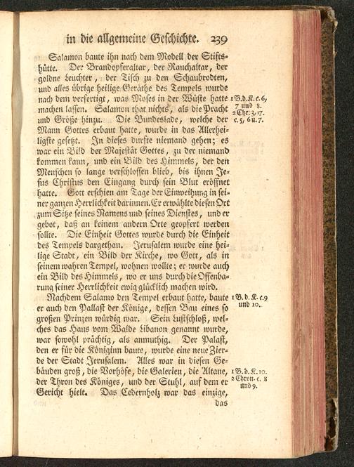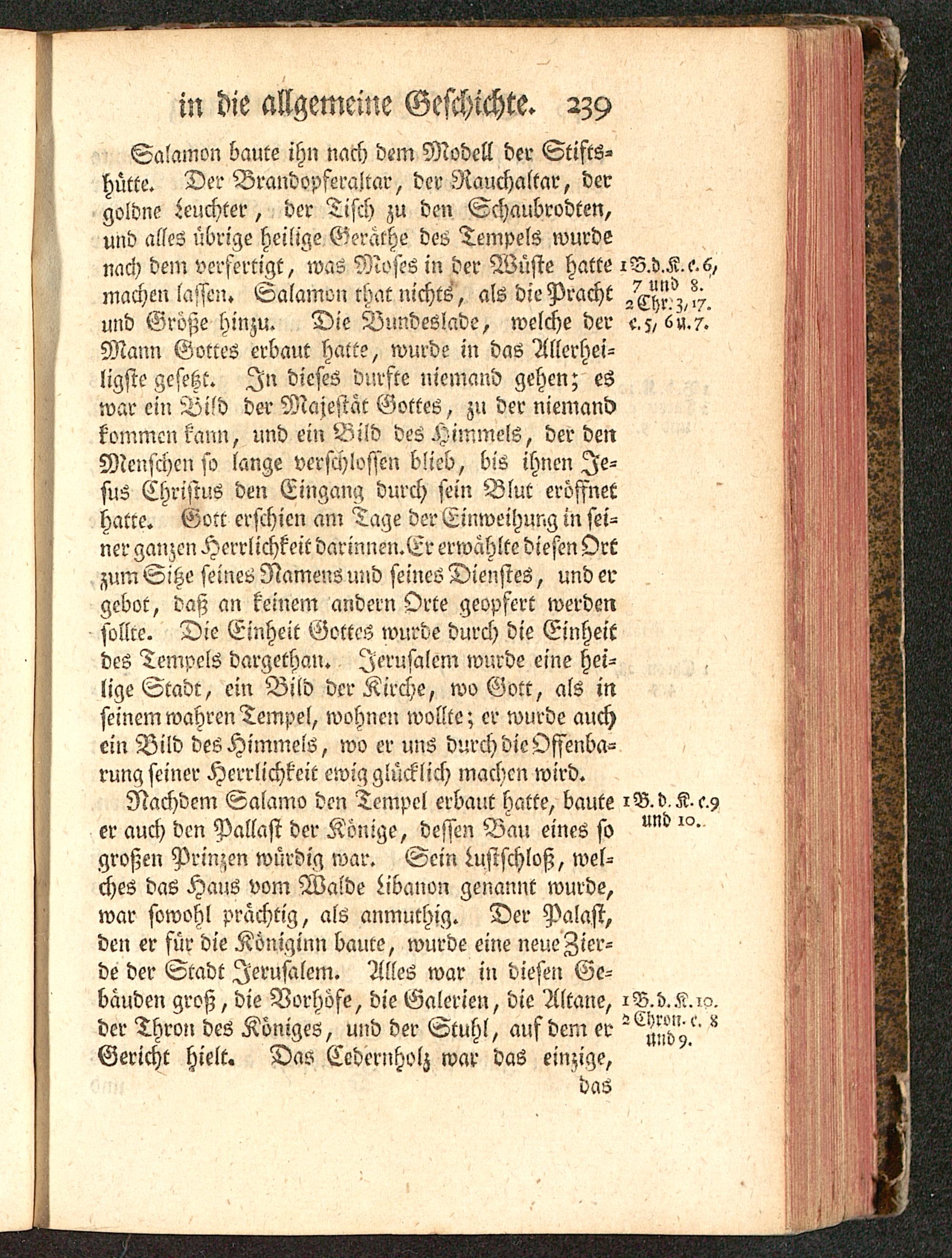 Nachdem Salamo den Tempel erbaut hatte, baute iB.d K-c.?er auch den Pallast der Könige, dessen Bau eines so ""^ ^'großen Prinzen würdig war. Sein Lustschloß, wel-ches das Haus vom Walde Libanon genannt wurde,war sowohl prächtig, als anmuthig. Der Palast,den er für die Königinn baute, wurde eine neue Zier-de der Stadt Jerusalem . Alles war in diesen Ge-bäuden groß, die Vorhöfe, die Galerien, die Altane, iB.d.K.io.der Thron des Königes, und der Stuhl, auf dem er '^s^' ^Gericht hielt. Das Cedernholz war das einzige,