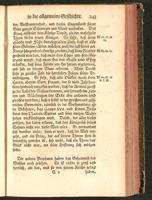 der Vollkommenheit, und diesen Gegenstand seinerGüte ganz in Schmerzen und Elend versunken. DasKreuz erscheint dem Könige David , als der wahrhafteThron dieses neuen Königes. Er sieht, daß seine Ps---, l7.'«.Hände und Füße durchgraben sind, daß er alle ^'seine Gebeine-ahlen möchte, weil die last seines amKreuze hängendenieibes ihn zerrüttet,daß seineFxleider Ps.69,2-.-z.getheilt werden, daß man dasLoos um ftm Ge-wand wirft, daß man ihn mir Galle und Eßig tranker, daß seine Feinde um ihn herum ergrimmen,und sich an seinem Blute erfreuen. Allein Davidsieht zu gleicher Zeit die herrlichen Folgen seiner Er-niedrigung. Er sieht/ daß alle Völker nach dem Ps.--/-6- 27Herrn, ihrem Gott / fragen, der so viele Iahrhun- ^ ^'derte hindurch vergessen worden; daß die Armen zuerstzu der Tafel des Meßias kommen, und hernach die Fet-ten und Mächtigen der Erde ihn anbeten undpreisen werden; daß er selbst in dergroßen und zahl-reichen Gemeinde / nämlich in der Versammlung al-ler Bekehrten, das Haupt seyn / und fiinen Brü-dern den Hainen Gottes und seine ewigen Wahr-heiten verkündigen wird. David / der alles diesesgesehen, hat dabey erkannt, daß das Königreich seinesSohnes nicht von dieser Welt wäre. Er verwundertsich darüber nicht; denn er weis, daß die Welt ver-geht, und ein Prinz, der auf seinem Throne stets sodemüthig gewesen ist, sah wohl, daß ein Thron dasGlück nicht war, wo seine Hoffnung sich endigensollte.