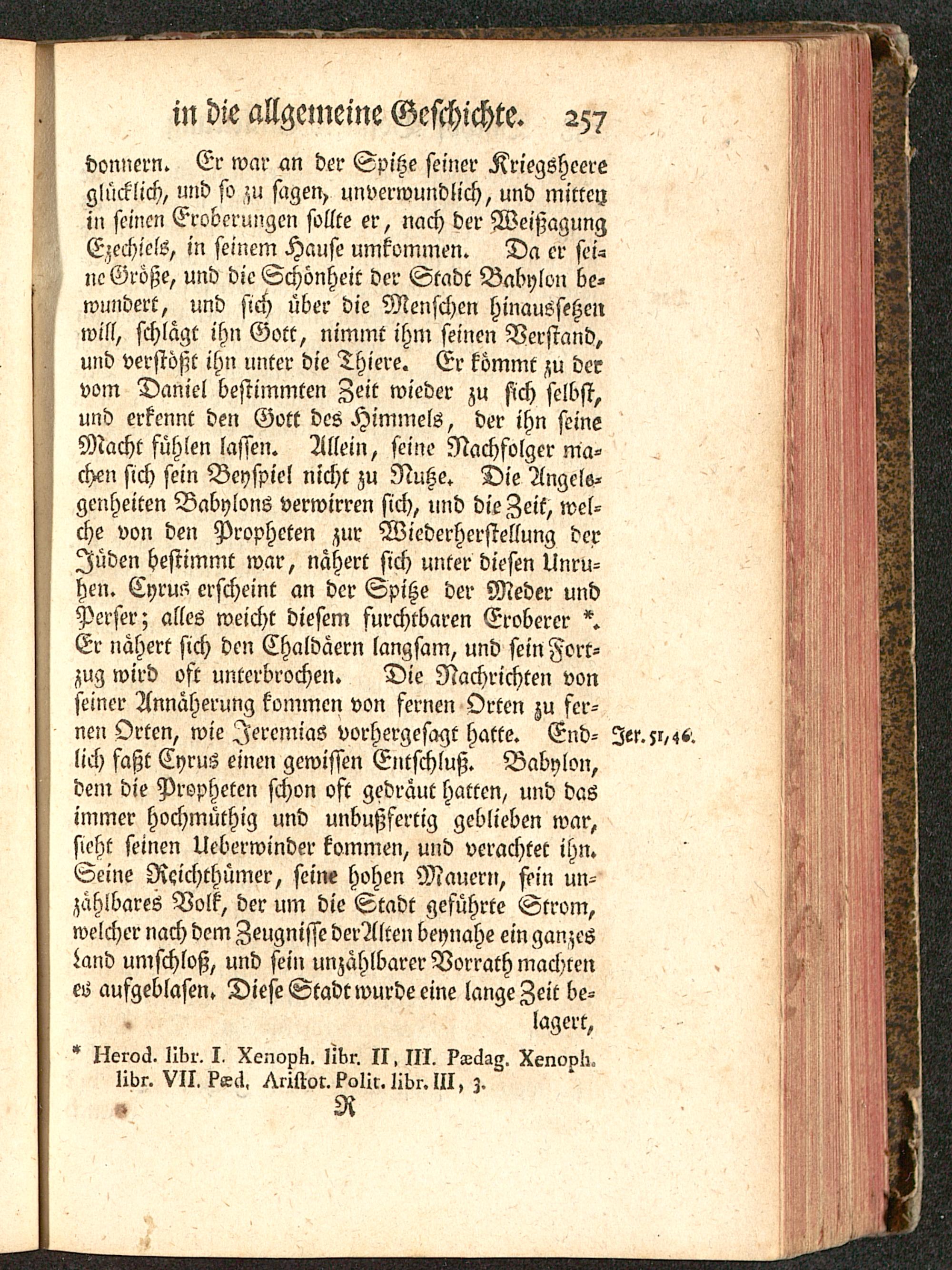 donnern. Er war an der Spitze seiner Kriegsheereglücklich, und so zu sagen, unverwundlich, und mitten,ii, seinen Eroberungen sollte er, nach der WeißagungEzechielö, in seinem Hause umkommen. Da er sei-ne Größe, und die Schönheit der Stadt Babylon be-wundert, und sich über die Menschen hinaussehenwill, schlagt ihn Gott, nimmt ihn: seinen Verstand,und verstößt ihn unter die Thiere. Er kömmt zu dervom Daniel bestimmten Zeit wieder zu sich selbst,und erkennt den Gott des Himmels, der ihn seineMacht fühlen lassen. Allein, seine Nachfolger ma-che-, sich sein Beyspiel nicht zu Nutze. Die Angele-genheiten Babylons verwirren sich, und die Zeit, wel-che von den Propheten zur Wiederherstellung derIüden bestimmt war, nähert sich unter diesen Unru-hen. Cyrus erscheint an der Spitze der Meder undPerser; alles weicht diesem furchtbaren Eroberer *.Er nähert sich den Chaldäern langsam, und sein Forr-zug wird oft unterbrochen. Die Nachrichten vonseiner Annäherung kommen von fernen Orten zu fer-nen Orten, wie IercmiaS vorhergesagt hatte. End- Ier.5r,4«.lich faßt Cyrus einen gewissen Entschluß. Babylon,dem die Propheten schon oft gedräut hatten, und dasimmer hochmüthig und unbußfertig geblieben war,sieht seinen Ueberwinder kommen, und verachtet ihn.Seine Reichthümer, seine hohen Mauern, fein un-> zählbares Volk, der um die Stadt geführte Strom,welcher nach dem Zeugnisse derAlten beynahe ein ganzesLand umschloß, und sein unzählbarer Vorrath machtenes aufgeblasen. Diese Stadt wurde eine lange Zeit be-lagert,