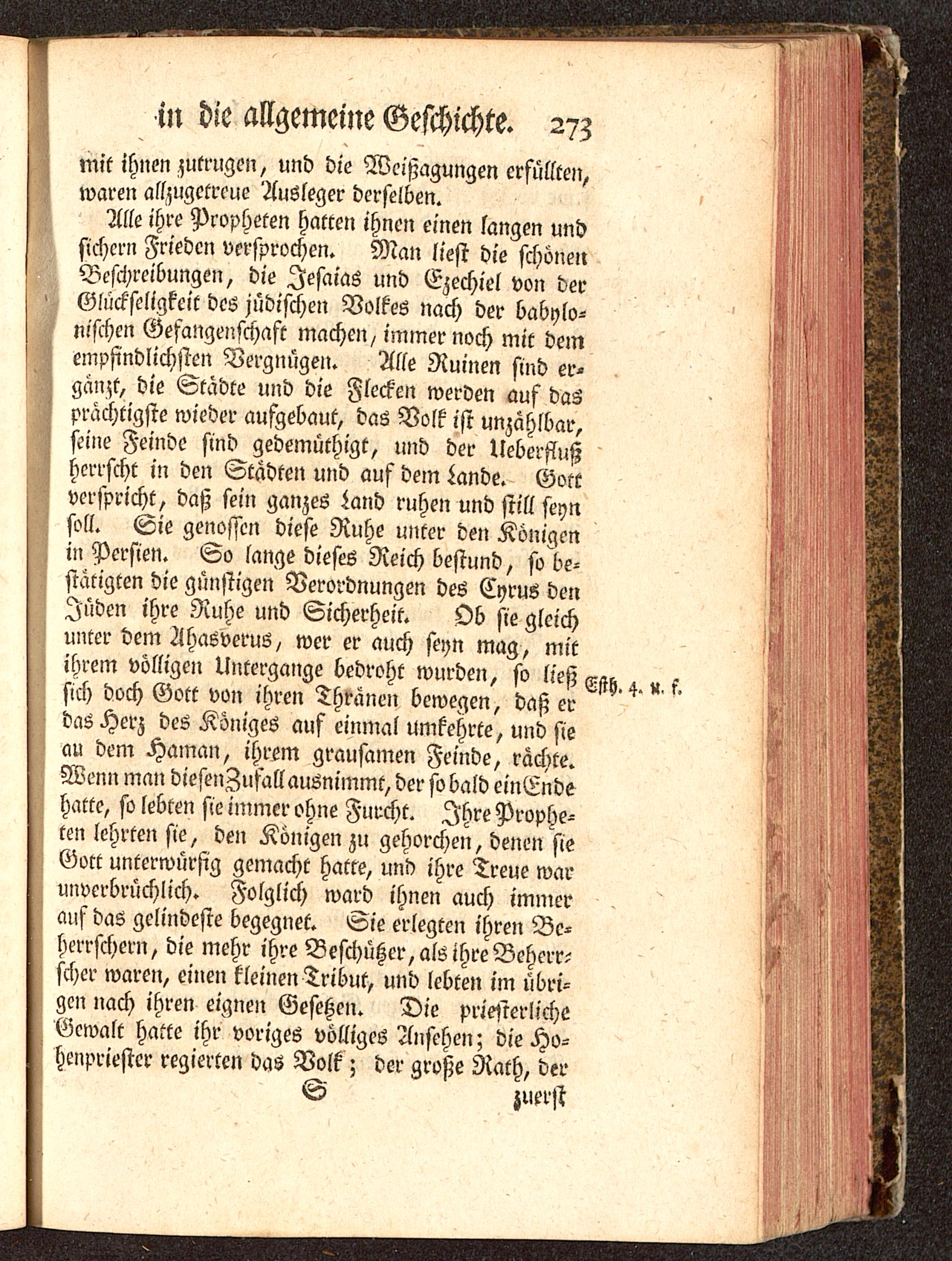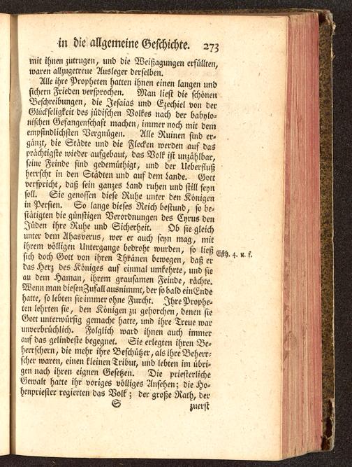 Alle ihre Propheten hatten ihnen einen langen undsichern Frieden versprochen. Man liest die schönenBeschreibungen, die Iesaias und Ezechiel von derGlückseligkeit des jüdischen Volkes nach der babylo-nischen Gefangenschaft machen / immer noch mit deinempfindlichsten Vergnügen. Alle Ruinen sind er-gänzt, die Städte und die Flecken werden auf dasprächtigste wieder aufgebaut, das Volk ist unzählbar,seine Feinde sind gedemüthigt, lind der Ueberflußherrscht in den Städten und auf dein Lande. Gott verspricht, daß sein ganzes Land ruhen und still seynsoll. Sie genossen diese Ruhe unter den Königenin Persien . So lange dieses Reich bestund, so be-stätigten die günstigen Verordnungen des Cyruö denIüden ihre Ruhe und Sicherheit. Ob sie gleichunter dem Ahasverus, wer er auch seyn mag, mitihrem völligen Untergange bedroht wurden, so ließ ^sich doch Gott von ihren Thränen bewegen, daß erdas Herz des Königes auf einmal umkehrte, und sieau dem Hamcm, ihrem grausamen Feinde, rächte.Wenn man diesenZufall ausnimmt, der so bald cinEndehatte, so lebten sie immer ohne Furcht. Ihre Prophe-ten lehrten sie, den Königen zu gehorchen, denen sieGott unterwürfig gemacht hatte, und ihre Treue waruiwerbrüchlich. Folglich ward ihnen auch immerauf das gelindeste begegnet. Sie erlegten ihren Be-herrschern, die mehr ihre Beschüßer, als ihre Beherr-scher waren, einen kleinen Tribut, und lebten im übri-gen nach ihren eignen Geseßcn. Die priesterlicheGewalt hatte ihr voriges völliges Ansehen; die Ho-henpriester regierten das Volk ; der große Rath, der