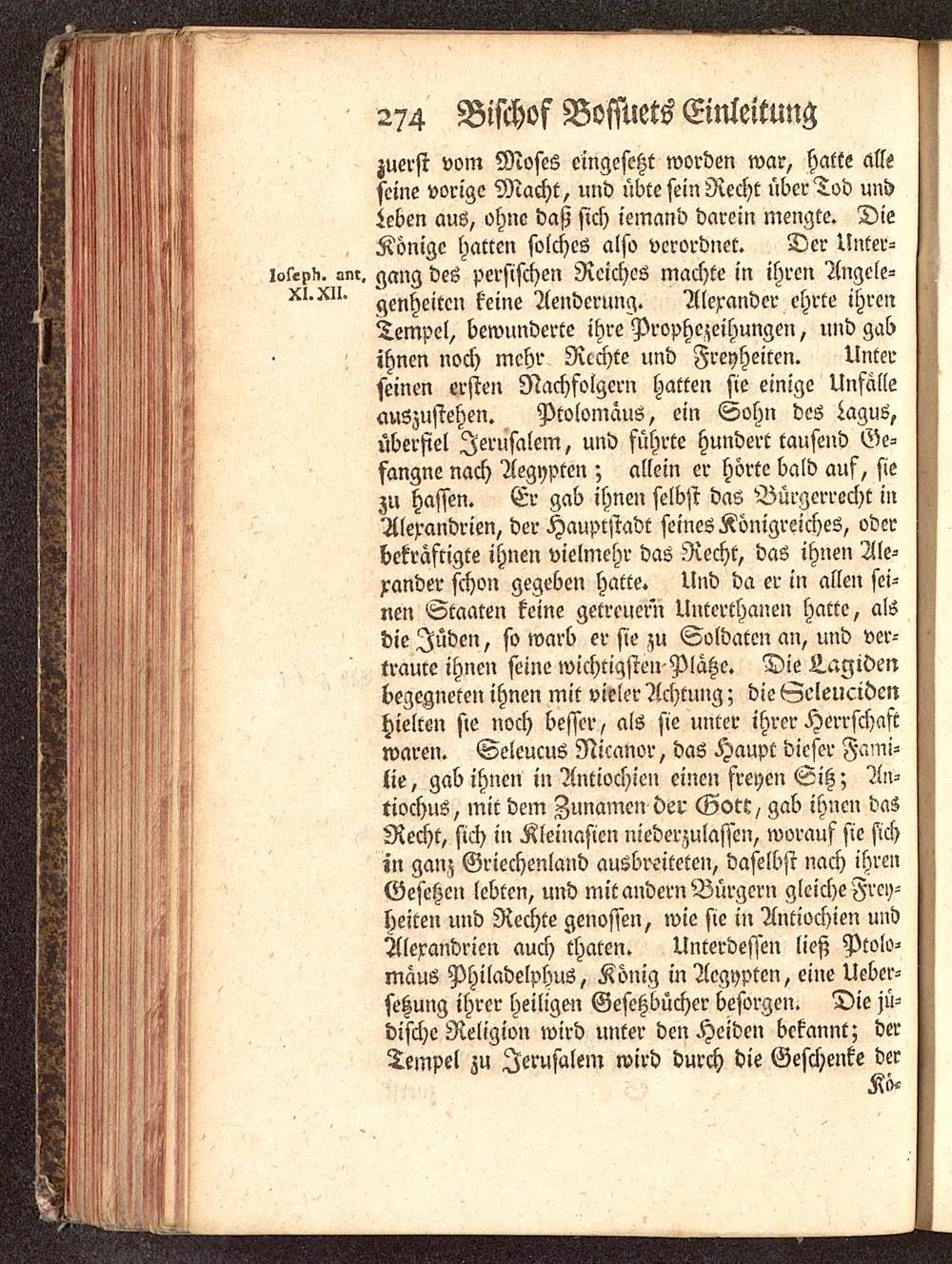 zuerst vom Moses eingesetzt worden war, hatte alleseine vorige Macht, und übte sein Recht über Tod undLeben aus, ohne daß sich iemand darein mengte. DieKönige hatten solches also verordnet. Der Unter-lolepii. mir. gang des persischen Reiches machte in ihren Angele-gescheiten keine Aenderung. Alexander ehrte ihrenTempel, bewunderte ihre Prophezeihungen, und gab! ihnen noch mehr Rechte und Freyheiten. Unterseinen erstell Nachfolgern hatten sie einige Unfälleauszustehen. Ptolomaus, ein Sohn des Lagus,überfiel Jerusalem, und führte hundert tausend Ge-fangne nach Aegypten ; allein er hörte bald auf, siezu hassen. Er gab ihnen selbst das Bürgerrecht iilAlexandrien, der Hauptstadt seines Königreiches, oderbekräftigte ihnen vielmehr das Recht, das ihnen Ale-xander schon gegeben hatte. Und da er in allen sei-nen Staaten keine getreuern Unterthanen hatte, alsdie Juden, so warb er sie zu Soldaten an, und ver-traute ihnen seine wichtigsten Plätze. Die L.agidenbegegneten ihnen mit vieler Achtung; die Seleucidenhielten sie noch besser, als sie unter ihrer Herrschaftwaren. SeleucuS Nicanor, das Haupt dieser Fami-lie, gab ihnen in Antiochien einen freyen Sitz; An-tiochus, mit dem Zunamen der Gott, gab ihnen dasRecht, sich in Kleinasien niederzulassen, worauf sie sichin ganz Griechenland ausbreiteten, daselbst nach ihrenGesetzen lebten, und mit andern Bürgern gleiche Frey-heiten und Rechte genossen, wie sie in Antiochien undAlexandrien auch thaten. Unterdessen ließ Ptolo-mäus Philadelphus, König in Aegypten , eine Ueber-setzung ihrer heiligen Gesetzbücher besorgen. Die jü-dische Religion wird unter den Heiden bekannt; derTempel zu Jerusalem wird durch die Geschenke der