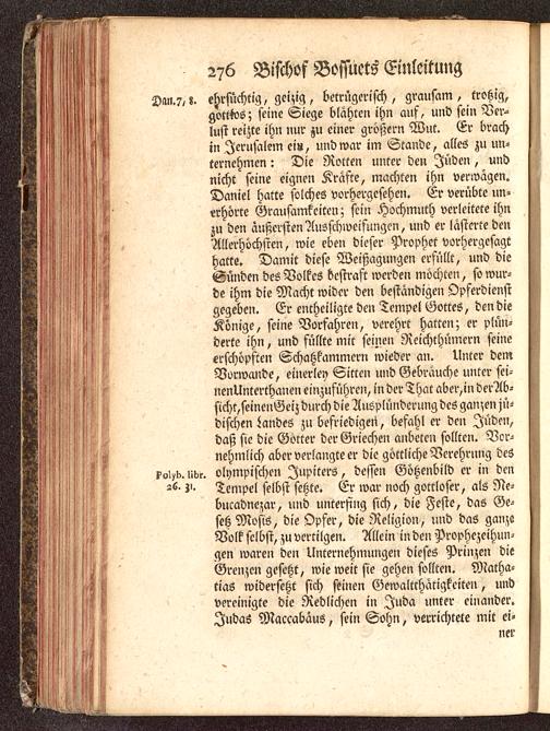 Van.?,!, ehrsüchtig, geizig, betrügerisch, grausam, trotzig,gott ^oö; seine Siege blähte» ihn auf, und sein Ver-lust reizte ihn nur zu einer größern Wut. Er brachin Jerusalem ei», und war im Stande, alles zu un-ternehmen : Die Rotten unter den Juden, undnicht seine eignen Kräfte, machten ihn venvägen.Daniel hatte solches vorhergesehen. Er verübte un-erhörte Grausamkeiten; sein Hochmuth verleitete ihnzu den äußersten Ausschweifungen, und er lästerte denAllerhöchsten, wie eben dieser Prophet vorhergcsagrhatte. Damit diese Weißagungen erfüllt, und dieSünden des Volkes bestraft werden möchten, so wur-de ihm die Macht wider den beständige!, Opferdienstgegeben. Er entheiligte den Tempel Gottes, den dieKönige, seine Vorfahren, verehrt hatten; er plün-derte ihn, und füllte mit seinen Reichthümern seineerschöpften Schatzkammern wieder an. Unter demVorwcmde, einerley Sitten und Gebräuche unter sei-nenUnterthanen einzuführen, in der Thal aber,in derAb-sicht,seinenGeiz durch die Ausplünderung des ganzen jü-dischen Landes zu befriedigen", befahl er den Jüden,daß sie die Götter der Griechen anbeten sollten. Vor-nehmlich aber verlangte er die göttliche Verehrung des