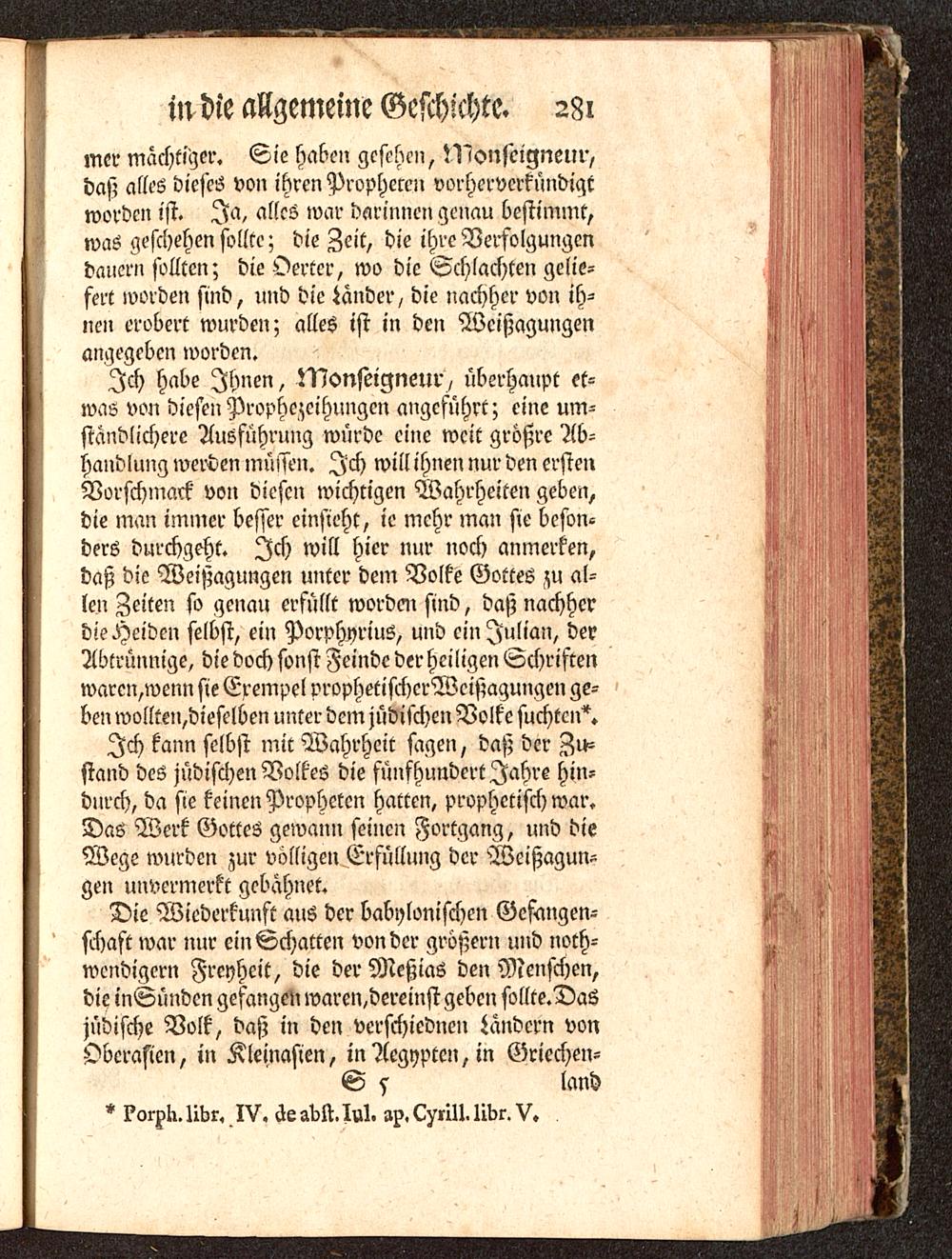 Ich habe Ihnen, Monseigneur, überhaupt et-was von diesen Prophezeiungen angeführt; eine um-ständlichere Ausführung würde eine weit größre Ab-handlung werden müssen. Ich will ihnen nur den erstenVorschmark von diesen wichtigen Wahrheiten geben,die man immer besser einsieht, ic mehr man sie beson-ders durchgeht. Ich will hier nur noch anmerken,daß die Weißagungen unter dem Volke Gottes zu al-len Zeiten so genau erfüllt worden sind, daß nachherdie Heiden selbst, ein PorphyriuS, und ein Julian, derAbtrünnige, die doch sonst Feinde der heiligen Schriftenwaren,wenn sie Exempel prophetischcrWcißagungen ge-be!, wollten,dieselben unter dem jüdischen Volke suchten*.