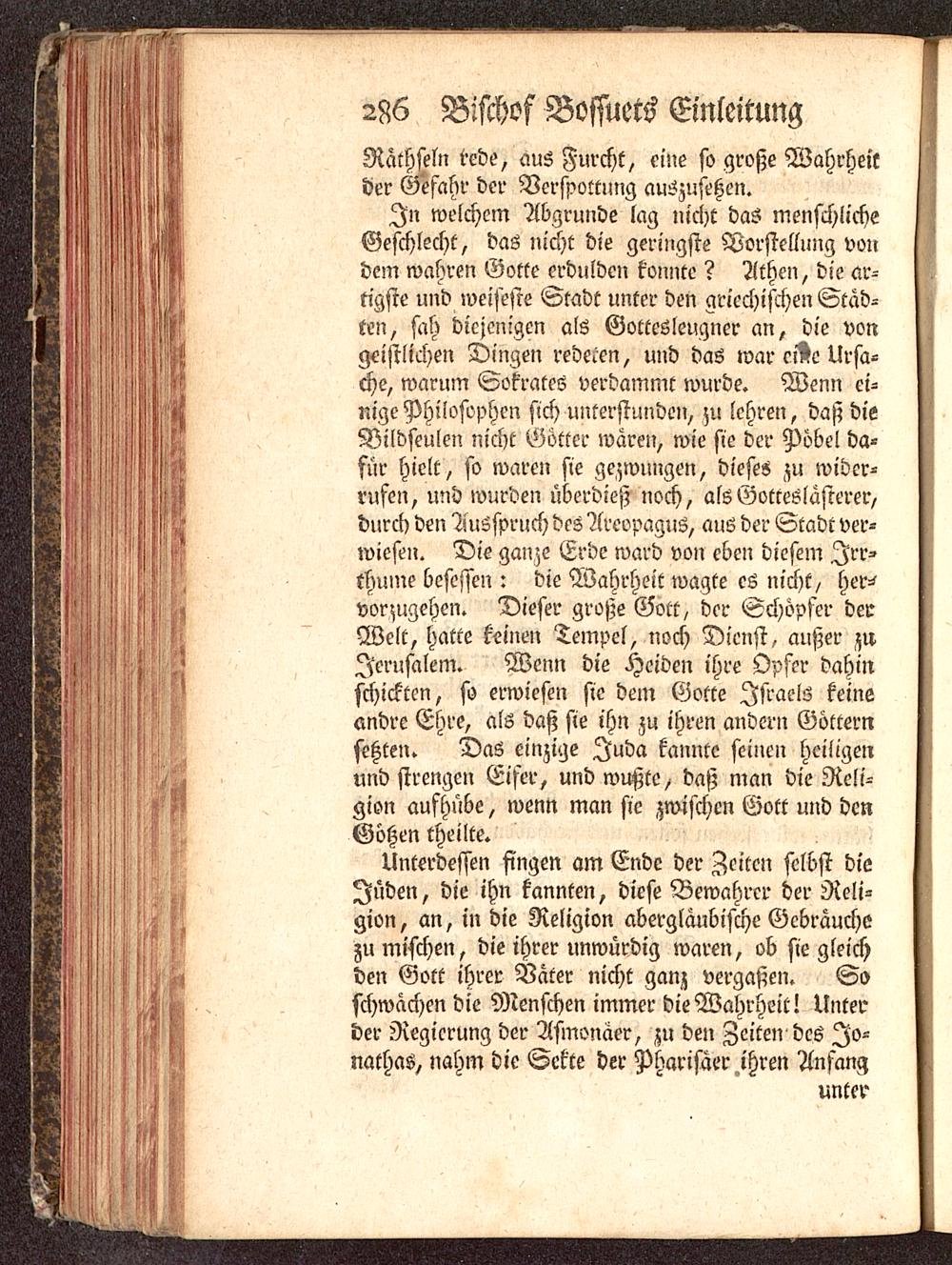 In welchem Abgrunde lag nicht das menschlicheGeschlecht, das nicht die geringste Vorstellung vondem wahren Gotte erdulden konnte ? Athen , die ar-tigste und weiseste Stadt unter den griechischen Städ-ten, sah diejenigen als Gottesleugner an, die vongeistlichen Dingen redeten, und das war eiße Ursa-che, warum Sokrates verdammt wurde. Wenn ei-nige Philosophen sich unterstunden, zu lehren, daß dieVildseulen nicht Götter wären, wie sie der Pöbel da-für hielt, so waren sie gezwungen, dieses zu wider-rufen, und wurden überdieß noch, als Gotteslästerer,durch den Ausspruch des Areopagus, aus der Stadt ver-wiesen. Die ganze Erde ward von eben diesem Irr-thume besessen : die Wahrheit wagte es nicht, her-'vorzugehen. Dieser große Gott, der Schöpjer derWelt, hatte keinen Tempel, noch Dienst, außer zuJerusalem . Wenn die Heiden ihre Opfer dahinschickten, so erwiesen sie dem Gotte Israels keineandre Ehre, als daß sie ihn zu ihren andern Götternsehten. Das einzige Juda kannte seinen heiligenund strengen Eifer, und wußte, daß man die Reli-gion aufhübe, wenn man sie zwischen Gott und denGötzen theilte.