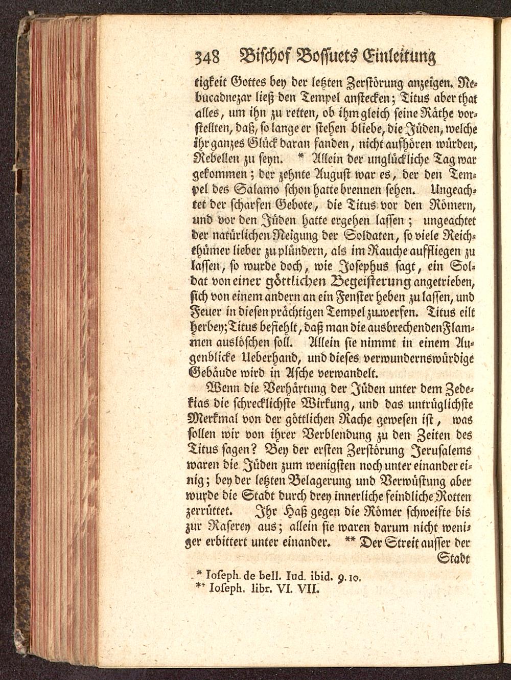 Wenn die Verhärtung der Juden unter dem Zede-kias die schrecklichste Wirkung, und das untrüglichsteMerkmal von der göttlichen Rache gewesen ist, wassollen wir von ihrer Verblendung zu den Zeiten desTitus sagen? Bey der ersten Zerstörung Jerusalems waren die Juden zum wenigsten noch unter einander ei-nig ; bey der letzten Belagerung und Verwüstung aberwurde die Stadt durch drey innerliche feindliche.Rottenzerrüttet. Ihr Haß gegen die Römer schweifte biszur Raserey aus; allein sie waren darum nicht wenuger erbittert unter einander. ** Der Streit ausser der
