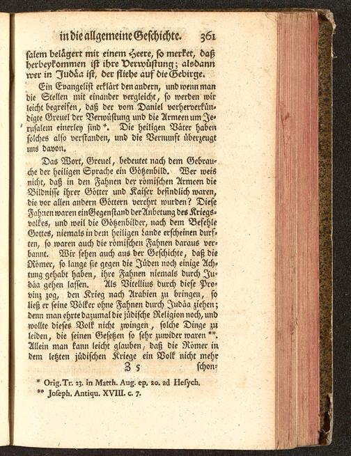 Das Wort, Greuel, bedeutet nach dem Gebrau-che der heiligen Sprache ein Götzenbild. Wer weisnicht, daß in den Fahnen der römischen Armeen dieBildnisse ihrer Götter und Kaiser befindlich waren,die vor allen andern Göttern verehrt wurden? DieseFahnen waren einGegenstand berAnbetung des Kriegs-volkes, und weil die Götzenbilder, nach dem BefehleGottes, niemals in dem heiligen lande erscheinen durf-ten, so waren auch die römischen Fahnen daraus ver-bannt. Wir sehen auch aus der Geschichte, daß dieRömer, so lange sie gegen die Juden noch einige Ach-tung gehabt haben, ihre Fahnen niemals durch Iu-däa gehen lassen. Als Vitellius durch diese Pro-vinz zog, den Krieg nach Arabien zu bringen, soließ er seine Völker ohne Fahnen durch Judaa ziehen;denn man ehrte dazumal die jüdische Religion noch, undwollte dieses Volk nicht zwingen, solche Dinge zuleiden, die seinen Gesetzen so sehr zuwider warenAllein man kann leicht glauben/ daß die Römer in,dem letzten jüdischen Kriege ein Volk nicht mehr