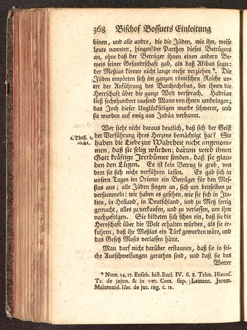 Wer sieht nicht daraus deutlich, daß sich der Geist<Thess. 2, der Verführung ihres Herzens bemächtigt hat? Siehaben die Liebe zur N>ahrheic nicht angenom-men, daß sie selig würden; darum wird ihnenGott kräftige Irrthümer finden, das) sie glau-ben den Lügen. Es ist kein Betrug so grob, vondem sie sich nicht verführen lassen. Es gab sich iirunsern Tagen im Oriente ein Betrüger für den Mes-sias aus; alle Iüden fingen an, sich um denselben zuversammeln: wir haben es gesehen, wie sie sich in Ita-lien, in Holland , in Deutschland , und zu Meß fertiggemacht, alles zu verkaufen, und zu verlassen, um ihmnachzufolgen. Sie bildeten sich schon ein, daß sie dieHerrschaft über die Welt erhalten würden, als sie er-fuhren, daß ihr Meßias ein Türkgeworden wäre, unddas Gesetz Mosis verlassen hätte.