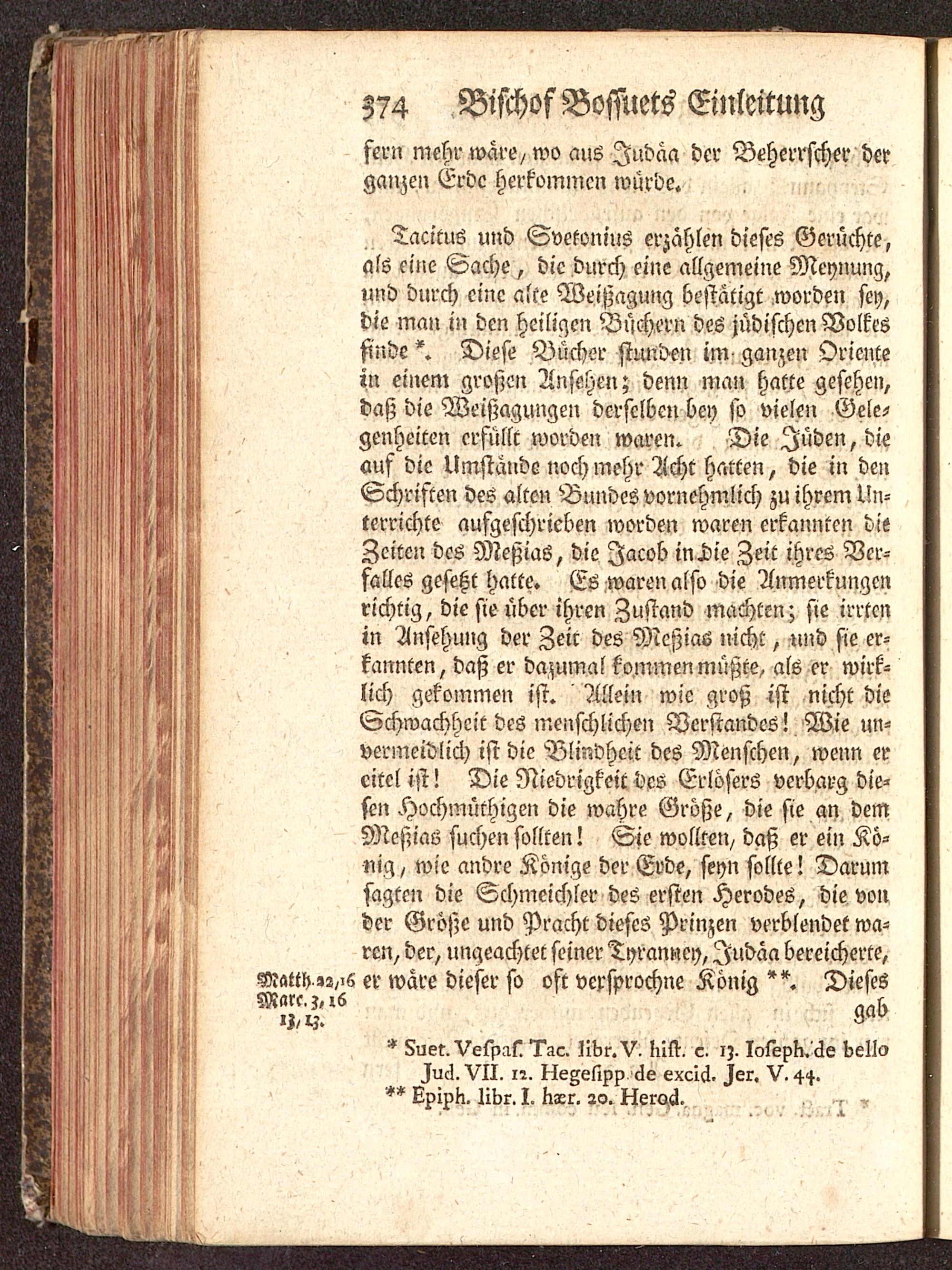Tacitus und Svetonius erzählen dieses Gerüchte,als eine Sache, die durch eine allgemeine Meynung,und durch eine alte Weißagung bestätigt worden sey,die man in den heiligen Büchern des jüdischen Volkesfinde *. Diese Bücher stunden im ganzen Orientein einem großen Ansehen; denn man hatte gesehen,daß die Weißagungen derselben bey so vielen Gele-genheiten ersüllt worden waren. Die Juden, dieauf die Umstände noch mehr Acht hatten, die in denSchriften des alten Bundes vornehmlich zu ihrem Un-terrichte aufgeschrieben worden waren erkannten dieZeiten des Meßias, die Jacob in Hie Zeit ihres Ver-falles gesetzt hatte. Es waren also die Anmerkungenrichtig, die sie über ihren Zustand machten; sie irrtenin Ansehung der Zeit des Meßias nicht, und sie er-kannten, daß er dazumal kommen müßte, als er wirk-lich gekommen ist. Allein wie groß ist nicht dieSchwachheit des menschlichen Verstandes! Wie un-vermeidlich ist die Blindheit des Menschen, wenn ereitel ist! Die Niedrigkeit des Erlösers verbarg die-sen Hochmüthigen die wahre Größe, die sie an demMeßias suchen sollten! Sie wollten/ daß er ein Kö-nig , wie andre Könige der Erde, seyn sollte! Darumsagten die Schmeichler des ersten Herodes, die vonder Größe und Pracht dieses Prinzen verblendet wa-ren, der, ungeachtet seiner Tyrannei), Judäa bereicherte,