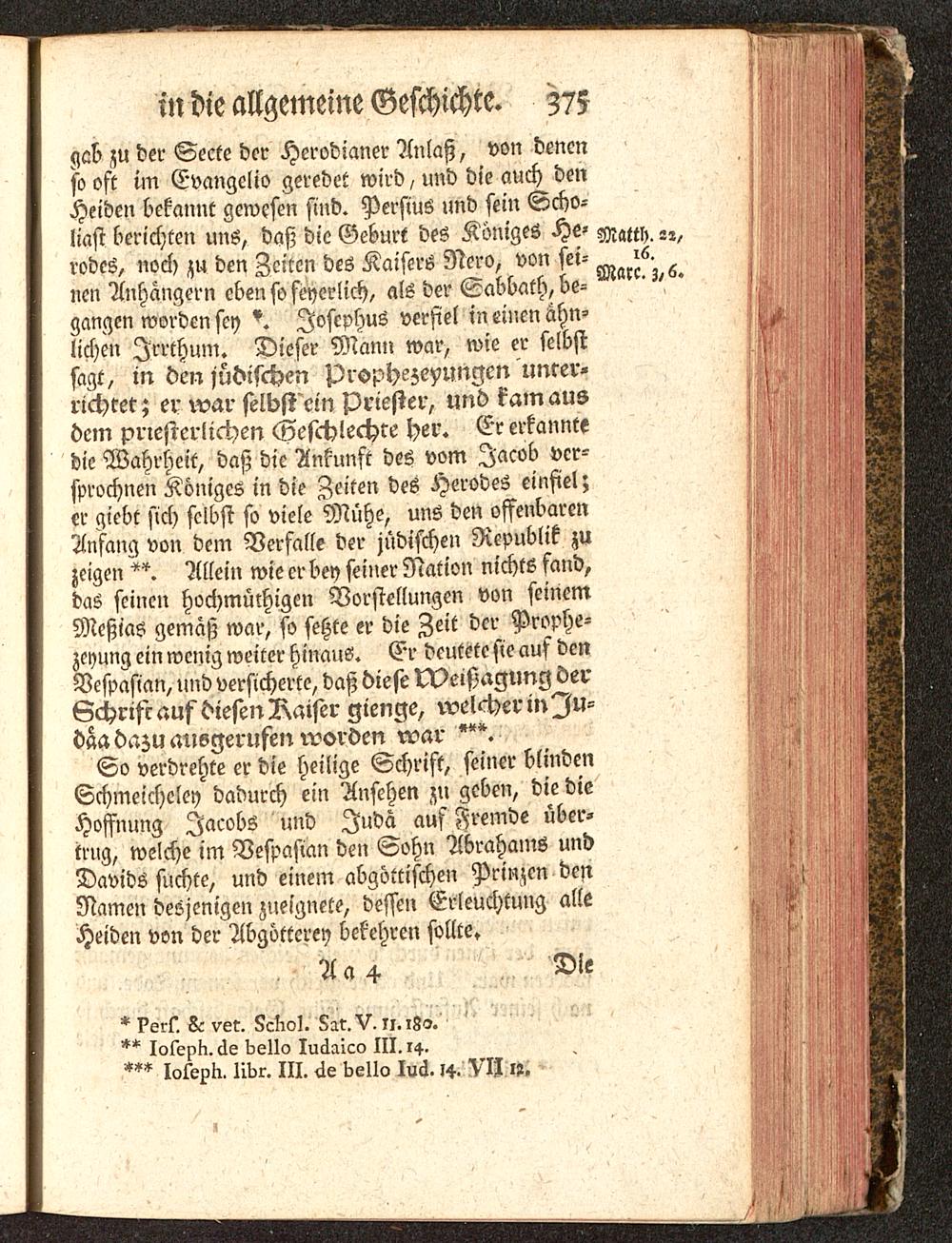 gab zu der Secte der Herodianer ?lnlaß, von denenso oft im Evangelio geredet wird, lind die auch denHeiden bekannt gewesen sind. Persius und sein Scho-liast berichteil uns, daß die Geburt des Königes He- Mrodes, noch zu den Zeiten des Kaisers Nero, von sei-nen Anhängern eben so feyerlich, als der Sabbath, be- 'gangen worden sey *. Josephus verfiel in einen ähn-lichen Irrthum. Dieser Mann war, wie er selbstsagt, in den jüdischen prsphezeyuNIen unter-richtet; ex war selbst ein Priester, und kam ausdem priesterlichen Geschlechte her. Er erkanntedie Wahrheit, daß die Ankunft des vom Jacob vcr-sprochnen Königes in die Zeiten des Herodes einfiel;er giebt sich selbst so viele Mühe, uns den offenbarenAnfang von dem Verfalle der jüdischen Republik zuzeigen **. Allein wie er bey seiner Nation nichte fand,das seinen hochmüchigen Vorstellungen von seinemMeßias gemäß war, so setzte er die Zeit der Prophe-zeyung ein wenig weiter hinaus. Er deutete sie auf denVespasian , und versicherte, daß diese N)eißagung der6chrift auf diesen Raifer gienge, welcher in Iu-daa dazu ausgerufen worden war