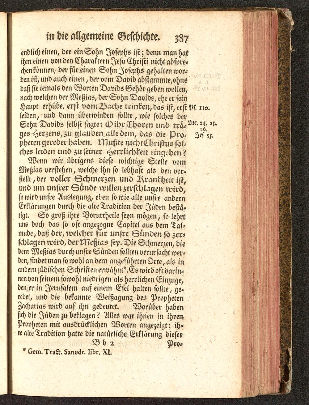Wenn wir übrigens diese wichtige Stelle vomMeßias verstehen, welche ihn so lebhaft als den vor-stellt , der voller Schmerzen und Rrantheic ist,und um unsrer Sünde willen zerschlagen wird,so wird unsre Auö-legung, eben sowie alle unsre andernErklärungen durch die alce Tradition der Juden bestä-tigt. So groß ihre Vorurtheile seyn mögen, so lehrtuns doch das so oft angezogne Capitel aus dem Tal-mude, daß der, welcher für unsre Sünden so zer-schlagen wird, der Meßias sey. Die Schmerzen, diedem Meßias durch unsre Sünden sollten verursacht wer-den, findet man so wohl an dem angeführten Orte, als inandern jüdischen Schriften erwähnt*.Es wird oft darin-nen von seinem sowohl niedrigen als herrlichen Einzüge,deiner in Jerusalem auf einem Esel halten sollte, ge-redet, und die bekannte Weißagung des ProphetenZacharias wird auf ihn gedeutet. Worüber habensich die Juden zu beklagen? Alles war ihnen in ihrenPropheten mit ausdrücklichen Worten angezeigt-, ih-re alte Tradition hatte die natürliche Erklärung dieserBb 2 Pro--