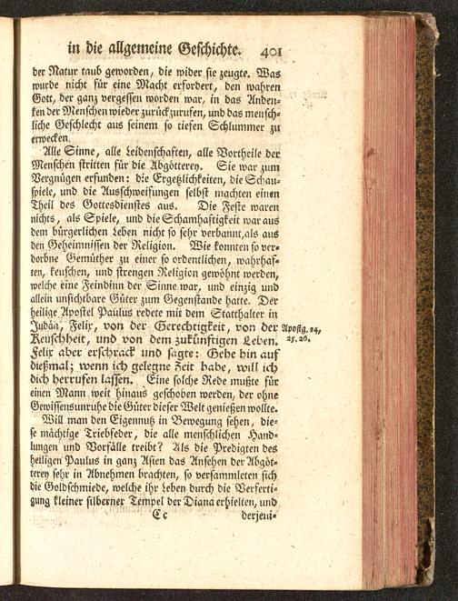 Alle Sinne, alle Leidenschaften, alle Vortheile derMenschen stritten für die Abgötterei). Sie war zumVergnügen erfunden: die Ergetzlichkeiten, die Schau-spiele, und die Ausschweifungen selbst machten einenTheil des Gottesdienstes aus. Die Feste warennichts, als Spiele, und die Schalkhaftigkeit war ausdem bürgerlichen Leben nicht so sehr verbannl,als ausden Geheimnissen der Religion. Wie konnten so vcr-dorbne Gemüther zu einer so ordentlichen, wahrhaf-ten, keuschen, und strengen Religion gewöhnt werden,welche eine Feindinn der Sinne war, und einzig undallein unsichtbare Güter zum Gegenstände hatte. Derheilige Apostel Paulus redete mit dein Statthalter inIudäa , Felix, von der Gerechtigkeit, von der Apostg, ,4,Reufchheit, und von dem zukünftigen Leben.Felix aber erfchrac? und sagte: Gebe hin aufdießmal; wenn ich gelegne Zeit babe, will ichdich herrufen lassen. Eine solche Rede mußte füreinen Mann weit hinaus geschoben werden, der ohneGewissensunruhe die Güter dieser Welt genießen wollte.
