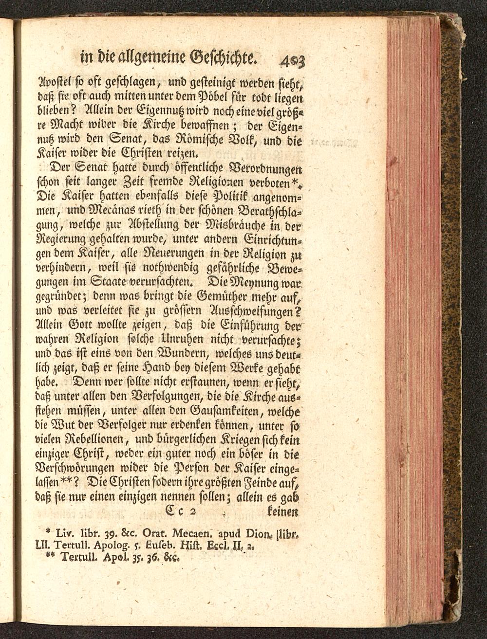 Der Senat hatte durch öffentliche Verordnungen)schon seit langer Zeit fremde Religionen verboten^.Die Kaiser hatten ebenfalls diese Politik angenom-men, und Mccanas rieth in der schönen Berathschla-gung, welche zu? Abstellung der Misbrauche in derRegierung gehalten wurde, unter andern Einrichtun-gen dem Kaiser, alle Neuerungen in der Religion zuverhindern, weil sis nothwendig gefährliche Bewe-gungen im Staate verursachten. Die Meynung wargegründet; denn was bringt die Gemüther mehr auf,und was verleitet sie zu grössern Ausschweifungen?Allein Gott wollte zeigen, daß die Einführung derwahren Religion solche Unruhen nicht verursachte;und das ist eins von den Wundern, welches uns deut-lich zeigt, daß er seine Hand bey diesem Werke gehabthabe. Denn wer sollte nicht erstaunen, wenn er sieht,daß unter allen den Verfolgungen, die die Kirche aus-stehen müssen, unter allen den Gausamkeitcn, welchedie Wut der Verfolger nur erdenken können, unter sovielen Rebellionen, und bürgerlichen Kriegen sich keineinziger Christ, weder ein guter noch ein böser in dieVerschwörungen wider die Person der Kaiser einge-lassen^? Die Christen fodern ihre größten Feinde auf,daß sie nur einen einzigen nennen sollenz allein es gab