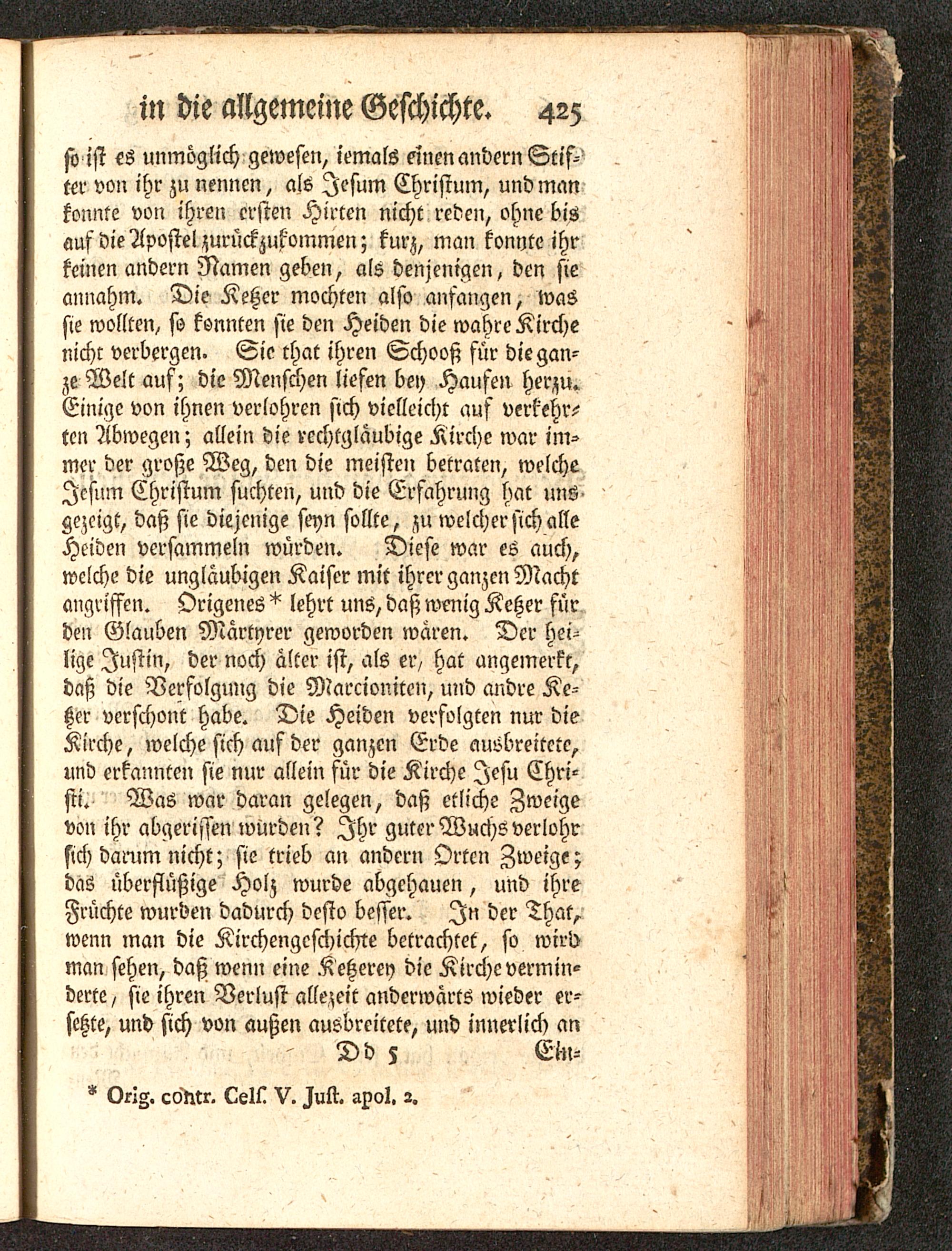 so ist es unmöglich gewesen, jemals einen andern Stif-ter von ihr zu nennen, als Jesum Christum, und mankonnte von ihren ersten Hirten nicht reden, ohne bisauf die Apostel zurückzukommen; kurz, man konnte ihrkeinen andern Namen geben, als denjenigen, den sieannahm. Die Keßer mochten also anfangen, wassie wollten, so konnten sie den Heiden die wahre Kirchenicht verbergen. Sie that ihren Schooß für die gan-ze Welt auf; die Menschen liefen bey Haufen herzu.Einige von ihnen verlohren sich vielleicht auf verkehr-ten Abwegen; allein die rechtgläubige Kirche war im-mer der große Weg, den die meisten betraten, welcheJcsum Christum suchten, und die Erfahrung hat unsgezeigt, daß sie diejenige seyn sollte, zu welcher sich alleHeiden versammeln würden. Diese war es auch,welche die ungläubigen Kaiser mit ihrer ganzen Machtangriffen. Origenes ^ lehrt uns, daß wenig Ketzer fürden Glauben Märtyrer geworden waren. Der hei-lige Justin, der noch alter ist, als er/ hat angemerkt,daß die Verfolgung die Marcioniten, und andre Ke-ßer verschont habe. Die Heiden verfolgten nur dieKirche, welche sich auf der ganzen Erde ausbreitete,und erkannten sie nur allein für die Kirche Jesu Chri-sti . Was war daran gelegen, daß etliche Zweigevon ihr abgerissen würden? Ihr guter Wuchs verlohrsich danim nicht; sie trieb an andern Orten Zweige;das überflüßige Holz wurde abgehauen, und ihreFrüchte wurden dadurch desto besser. In der That,wenn man die Kirchengeschichte betrachtet, so wirdman sehen, daß wenn eine Ketzerey die Kirche vermin-derte , sie ihren Verlust allezeit anderwärts wieder er-setzte, und sich von außen ausbreitete, und innerlich an