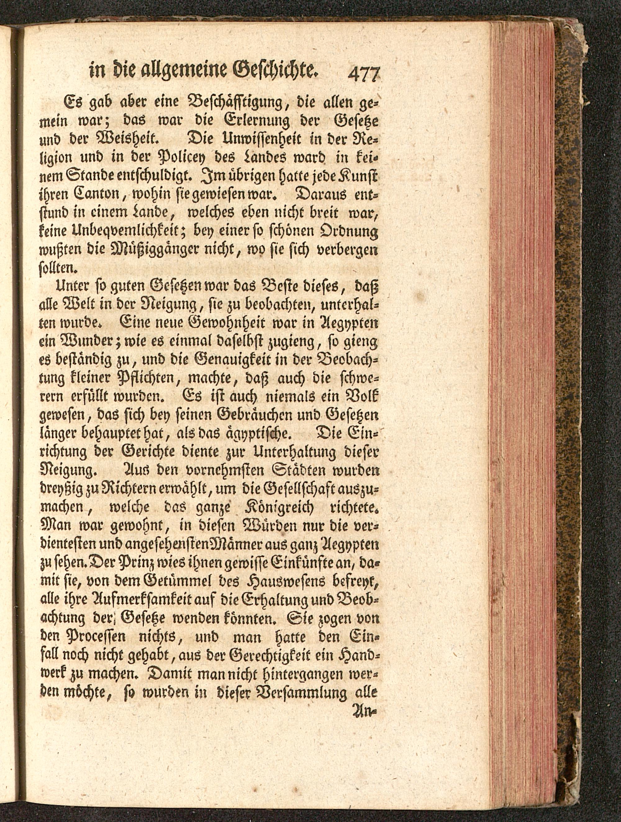 Unter so guten Gesetzen war das Beste dieses, daßalle Welt in der Neigung, sie zu beobachten, unterhal-ten wurde. Eine neue Gewohnheit war in Aegypten ein Wunder; wie es einmal daselbst zugicng, so giengeö beständig zu, und die Genauigkeit in der Beobach-tung kleiner Pflichten, machte, daß auch die schwe-rern erfüllt wurden. Es ist auch niemals ein Volkgewesen, das sich bey seinen Gebrauchen und Gesetzenlänger behauptet hat, als das ägyptische. Die Ein-richtung der Gerichte diente zur Unterhaltung dieserNeigung. Aus den vornehmsten Städten wurdendreyßig zu Richtern erwählt, um die Gesellschaft auszu-machen , welche das ganze Königreich richtete«Man war gewohnt, in diesen Würden nur die ver-dientesten und angesehenstenMänner aus ganz Aegypten zu sehen.Der Prinz wies ihnen gewisse Einkünfte an, da-mit sie, von dem Getümmel des Hauswesens befreyr,alle ihre Aufmerksamkeit auf die Erhaltung und Beob-achtung der; Gesetze wenden könnten. Sie zogen vonden Processen nichts, und man hatte den Ein-fall noch nicht gehabt, aus der Gerechtigkeit ein Hand-werk zu machen. Damit man nicht hintergangen wer-den möchte, so wurden in dieser Versammlung alle