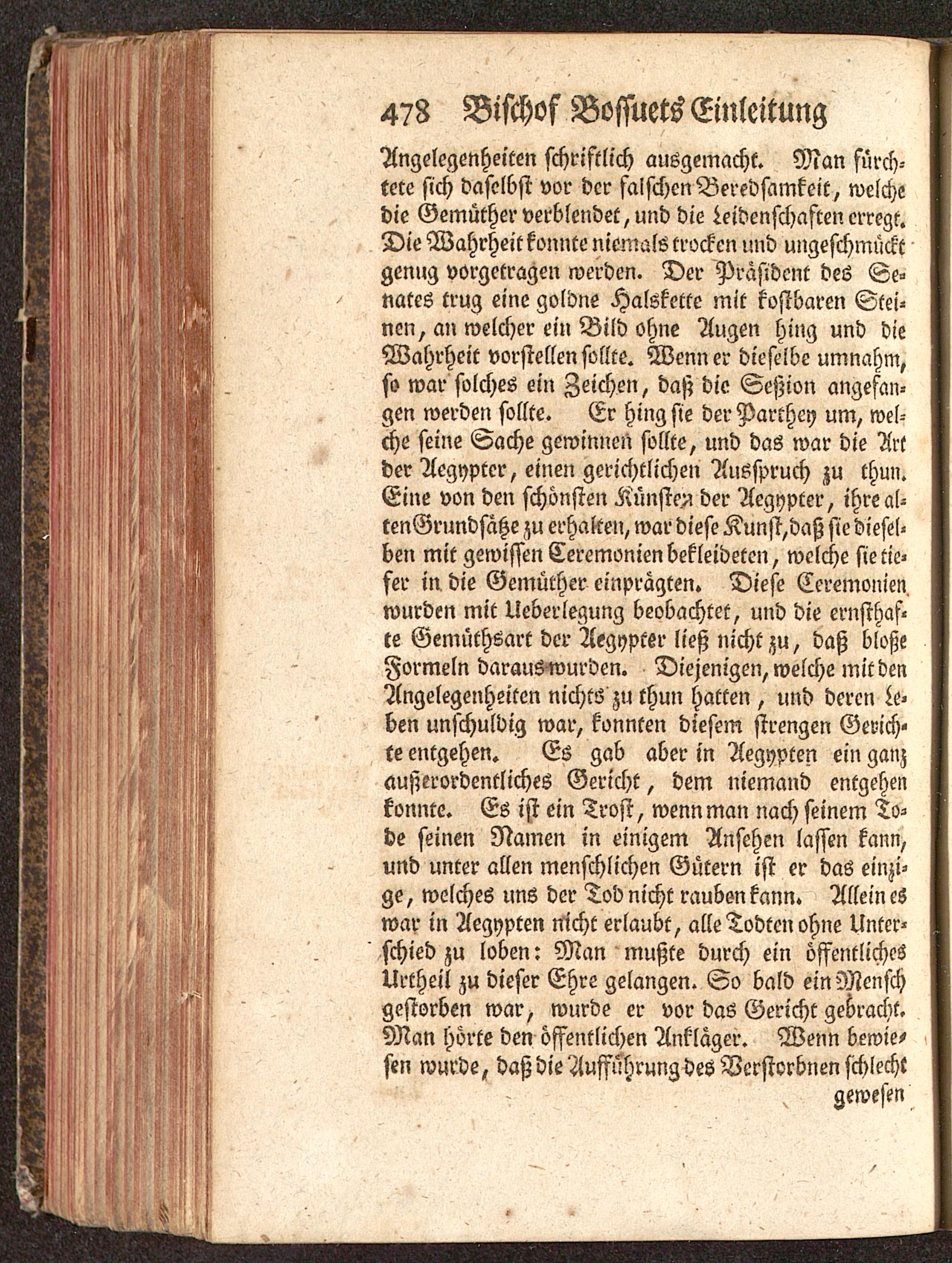 Angelegenheiten schriftlich ausgemacht. Man fürch-tete sich daselbst vor der falschen Beredsamkeit, welchedie Gemüther verblendet, und die Leidenschaften erregt.Die Wahrheit konnte niemals trocken und ungeschmücktgenug vorgetragen werden. Der Präsident des Se-nates trug eine goldne Halskette mit kostbaren Stei-nen, an welcher ein Bild ohne Augen hing und dieWahrheit vorstellen sollte. Wenn er dieselbe umnahm,so war solches ein Zeichen, das; die Seßion angefan-gen werden sollte. Er hing sie der Parthey um, wel-che seine Sache gewinnen sollte, und das war die Artder Aegypter, einen gerichtlichen Ausspruch zu thun.Eine von den schönsten Künsten der Aegypter, ihre al-tenGrundsäHe zu erhalten, war diese Kunst,daß sie diesel-ben mit gewissen Ceremonien bekleideten, welche sie tie-fer in die Gemüther einprägten. Diese Ceremonien,wurden mit Ueberlegung beobachtet, und die ernsthaf-te Gemüthsart der Aegypter ließ nicht zu, daß bloßeFormeln daraus wurden. Diejenigen, welche mit denAngelegenheiten nichts zuthun hatten, und deren Le-ben unschuldig war, konnten diesem strengen Gerich-te entgehen. Es gab aber in Aegypten ein ganzaußerordentliches Gericht, dem niemand entgehenkonnte. Es ist ein Trost, wenn man nach seinem To-de seinen Namen in einigem Ansehen lassen kann,und unter allen menschlichen Gütern ist er das einzi-ge , welches uns der Tob nicht rauben kann. Allein eSwar in Aegypten nicht erlaubt, alle Todten ohne Unter-schied zu loben: Man mußte durch ein öffentlichesUrtheil zu dieser Ehre gelangen. So bald ein Menschgestorben war, wurde er vor das Gericht geöracht.Man hörte den öffentlichen Ankläger. Wenn bewiessen wurde, daß die Aufführung des Verstorbnen schlecht