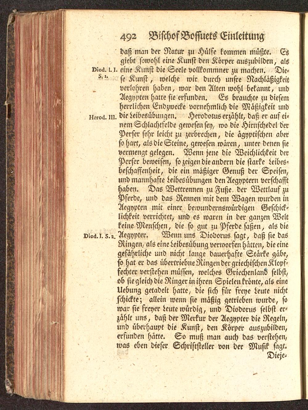 ' daß man der Natur zu Hülfe kommen müßte. Esgiebt sowohl eine Kunst den Körper auszubilden, alsvio<z. 1.1. eine Kunst die Seele vollkommner zu machen. Die-5-se Kunst, welche wir durch unsre Nachläßigkeitverlohren haben, war den Alten wohl bekannt, undAegypten hatte sie erfunden. Es brauchte zu diesemherrlichen Endzwecke vornehmlich die Mäßigkeit undu-roä. ni. die Leibesübungen. Herodotus erzahlt, daß er auf ei-nem Schlachtfelds gewesen sey, wo die Hirnschedel derPerser sehr leicht zu zerbrechen, die ägyptischen aberso hart, als die Steine, gewesen waren, unter denen sievermengt gelegen. Wenn jene die Weichlichkeit derPerser beweisen, so zeigen die andern die starke Leibes-beschaffenheit, die ein maßiger Genuß der Speisen,und mannhafte Leibesübungen denAegyptern verschaffthaben. Das Wettrennen zu Fuße, der Wettlauf zuPferde, und das Rennen mit dem Wagen wurden inAegypten mit einer bewundernswürdigen Geschick-lichkeit verrichtet, und es waren in der ganzen Weltkeine Menschen, die so gut zu Pferde saßen, als dievioä.i. 5.z. Aegypter. Wenn uns Diodorus sagt, daß sie dasRingen, als eine Leibesübung verworfen hätten, die einegefährliche und nicht lange dauerhafte Stärke gäbe,so hat er das übertriebne Ringen der griechischen Klopf-fechter verstehen müssen, welches Griechenland selbst,ob sie gleich die Ringer in ihren Spielen krönte, als eineUebung getadelt hatte, die sich für freye Leute nichtschickte; allein wenn sie mäßig getrieben wurde, sowar sie freyer Leute würdig, und Diodorus selbst er-zählt uns, daß der Merkur der Aegypter die Regeln,und überhaupt die Kunst, den Körper auszubilden,erfunden hätte. So muß man auch das verstehen,was eben dieser Schriftsteller von der Musik sagt.