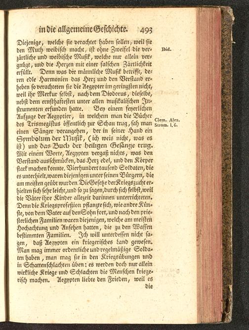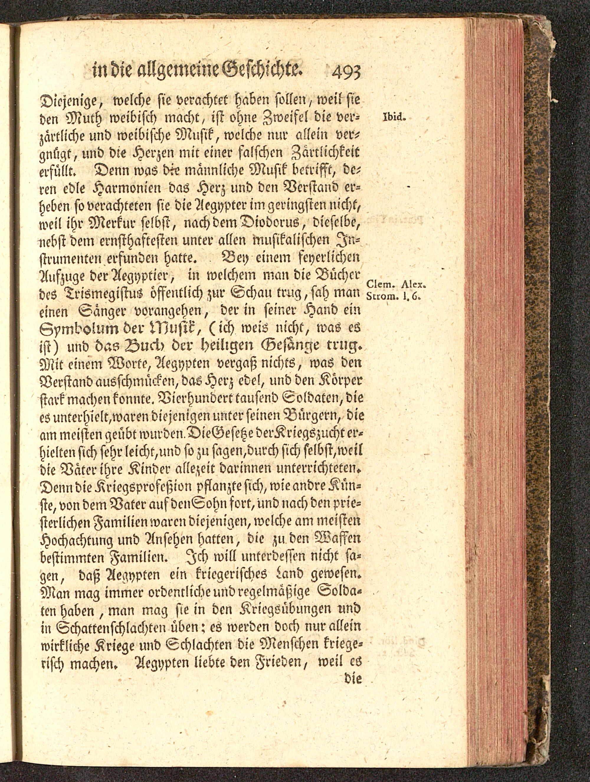 Diejenige, welche sie verachtet haben sollen / weil sieden Muth weibisch macht, ist ohne Zweifel die der- Mä.zärtliche und weibische Musik, welche nur allein ver-gnügt, und die Herzen mir einer falschen Zärtlichkeiterfüllt. Denn was die männliche Musik betrifft, de-ren edle Harmonien das Herz und den Verstand er-heben so verachteten sie die Aegyptcr im geringsten nicht,weil ihr Merkur selbst, nach dem Diodorus, dieselbe,»ebst dem ernsthaftesten unter allen musikalischen In-strumenten erfunden hatte. Bey einem feyerlichcnAufzuge der Aegyptier, in welchem man die Bücherdes Trismegistus öffentlich zur Schau trug, sah man ^^.^einen Sanger vorangehen, der in seiner Hand einGymdolum der Musik, (ich weis nicht, was esist) und das Duci.> der heiligen Gejan^e trug.Mit einem Worte, Aegypten vergaß nichts, was denVerstand ausschmücken, das Herz edel, und den Körperstark machen konnte. Vierhundert tausend Soldaten, diees unrerhielt,waren diejenigen unter seinen Bürgern, dieam meisten geübt wurden DieGesehe derKriegszucht er-hielten sich sehr leicht,und so zu sagen,durch sich selbst,weildie Väter ihre Kinder allezeit darinnen unterrichteten.Denn die Kriegsproscßion pflanzte sich, wie andre Kün-ste, von dem Vater aufdenSohn fort, und nach den prie-sterlichen Familien waren diejenigen, welche am meistenHochachtung und Ansehen hatten, die zu den Waffenbestimmten Familien. Ich will unterdessen nicht sa-gen, daß Aegypten ein kriegerisches Land gewesen.Man mag immer ordentliche und regelmäßige Solda-ten haben , man mag sie in den Kriegöübungen nndin Schattenschlachten üben: es werden doch nur alleinwirkliche Kriege und Schlachten die Menschen kriege-risch machen. Aegypten liebte den Frieden, weil es