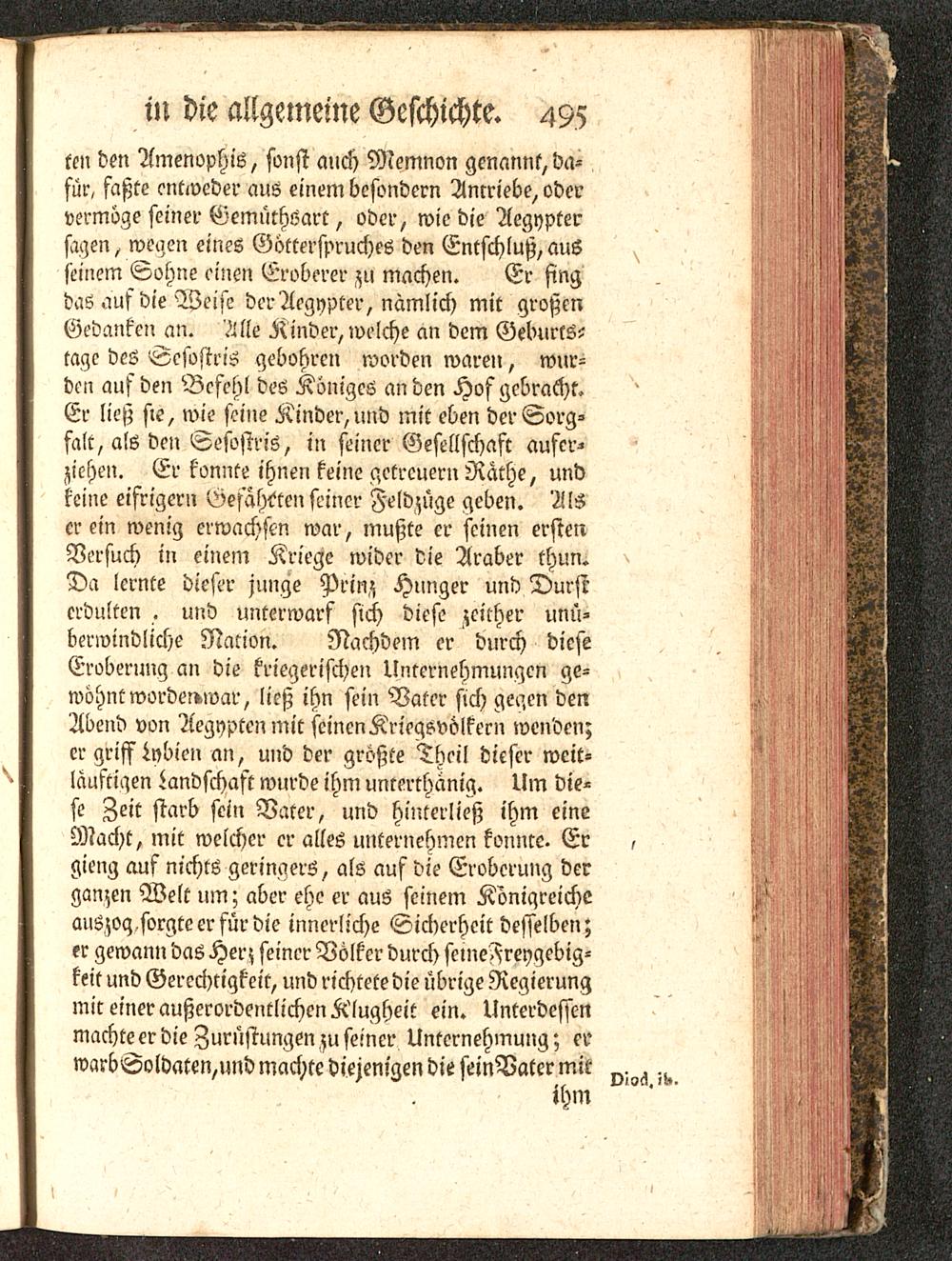 ten den Amenophis, sonst auch Memnon genannt, da-für, faßte entweder aus einem besondern Amriebe, odervermöge seiner Gemüthsart, oder, wie die Aegyptersagen, wegen eines Götterspruches den Entschluß, au6seinem Sohne einen Eroberer zu machen. Er fingdaö auf die Weise der Aegypter, nämlich mit großenGedanken an. Ä lle Kinder, welche an dem Gebnrtsütage des Sesostris gebobren worden waren, wur-den auf den Befehl des Königes an den Hof gebracht.Er ließ sie, wie seine Kinder, und mit eben der Sorg-falt, als den Sesostris, in seiner Gesellschaft aufer-zichen. Er konnte ihnen keine getreuern Rathe, undkeine eifrigern Gefährten seiner Feldzüge geben. Alser ein wenig erwachsen war, mußte er seinen erstenVersuch in einem Kriege wider die Araber thun.Da lernte dieser junge Prinz Hunger und Durstcrdulten . und unterwarf sich diese zcicher unü-berwindliche Nation. Nachdem er durch dieseEroberung an die kriegerischen Unternehmungen ge-wohnt wordei»war, ließ ihn sein Vater sich gegen denAbend von Aegypten mit seinenKrieqsvölkern wenden;er griff Lybicn an, und der größte Theil dieser weit-läufigen Landschaft wurde ihm umerrhanig. Um die-se Zeit starb sein Varer, und hinterließ ihm eineMacht, mit welcher er alles unternehmen konnte. Er ?gieng auf nichts geringerS, als auf die Eroberung derganzen Welt lim; aber ehe er aus seinem KönigreicheauSzog sorgte er für die innerliche Sicherheit desselben;er gewann das Her; seiner Völker durch scmeFreygebig-keit und Gerechtigkeit, und richtete die übrige Regierungmit einer außerordentlichen Klugheit ein. Unterdessenmachte er die Zurüstungen zu seiner Unternehmung; erwarbSoldaten,und machte diejenigen die seinVater mit ^