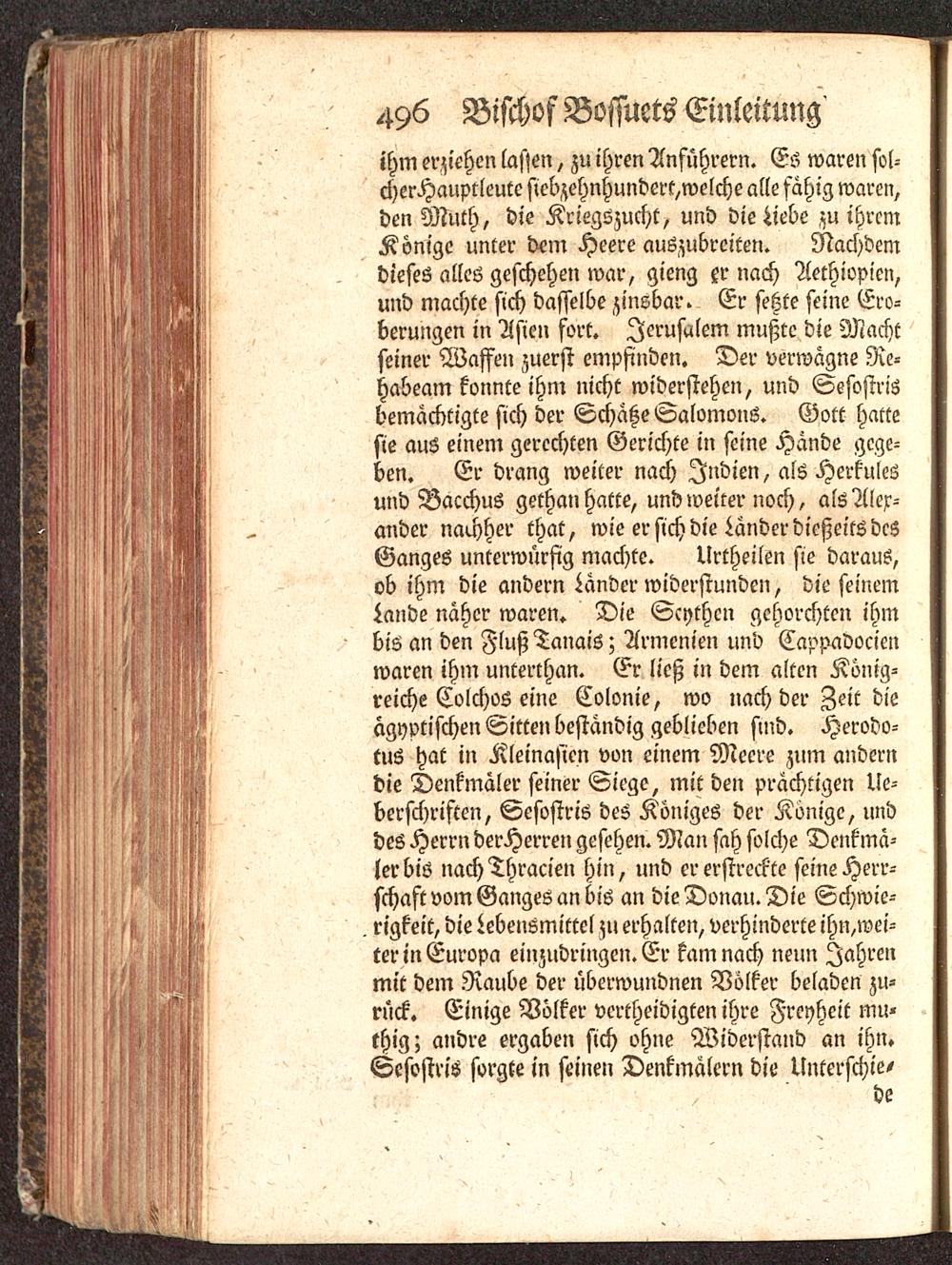 ihm erziehen lassen, zu ihren Anführern. Es waren sol-cherHcmprleutc sicbzehnhundert,welche alle fähig waren,den Muth, die Kriegszucht, und die Liebe zu ihremKönige unter dem Heere auszubreiten. Nachdemdieses alles geschehen war, gieng er nach Aethiopicn,und machte sich dasselbe zinsbar. Er setzte seine Ero-berungen in Asien fort. Jerusalem mußte die Machtseiner Waffen zuerst empfinden. Der verwagne Re-habeam konnte ihm nicht widerstehen, und Sesostris bemächtigte sich der Schätze Salomons. Gott hattesie aus einem gerechten Gerichte in seine Hände gege-ben. Er drang weiter nach Indien, als Herkulesund Bacchus gethan hatte, und weiter noch, als Alex-ander nachher that, wie er sich die Länder dießeits dcsGanges unterwürfig machte. Urtheilen sie daraus,ob ihm die andern Lander widerstunden, die seinemLande näher waren. Die Scythen gehorchten ihmbis an den FlußTanais; Armenien und Cappadocienwaren ihm Unterthan. Er ließ in dem alten König-reiche Colchos eine Colonie, wo nach der Zeit dieägyptischen Sitten beständig geblieben sind. Herodo-tus hat in Kleinasien von einem Meere zum anderndie Denkmäler seiner Siege, mit den prächtigen Ue-berschriftcn, Sesostris des Königes der Könige, unddes Herrn derHerren gesehen. Man sah solche Denkma-ler bis nach Thracien hin, und er erstreckte seine Herr-schaft vom Ganges an bis an die Donau . Die Schwie-rigkeit, die Lebensmittel zu erhalten, verhinderte ihn,wei-ter in Europa einzudringen. Er kam nach neun Iahrenmit dem Raube der überwundnen Völker beladen zu-rück. Einige Völker vertheidigten ihre Freyheit mu-thig; andre ergaben sich ohne Widerstand an ihn.Sesostris sorgte in seinen Denkmalern die Unterschie,