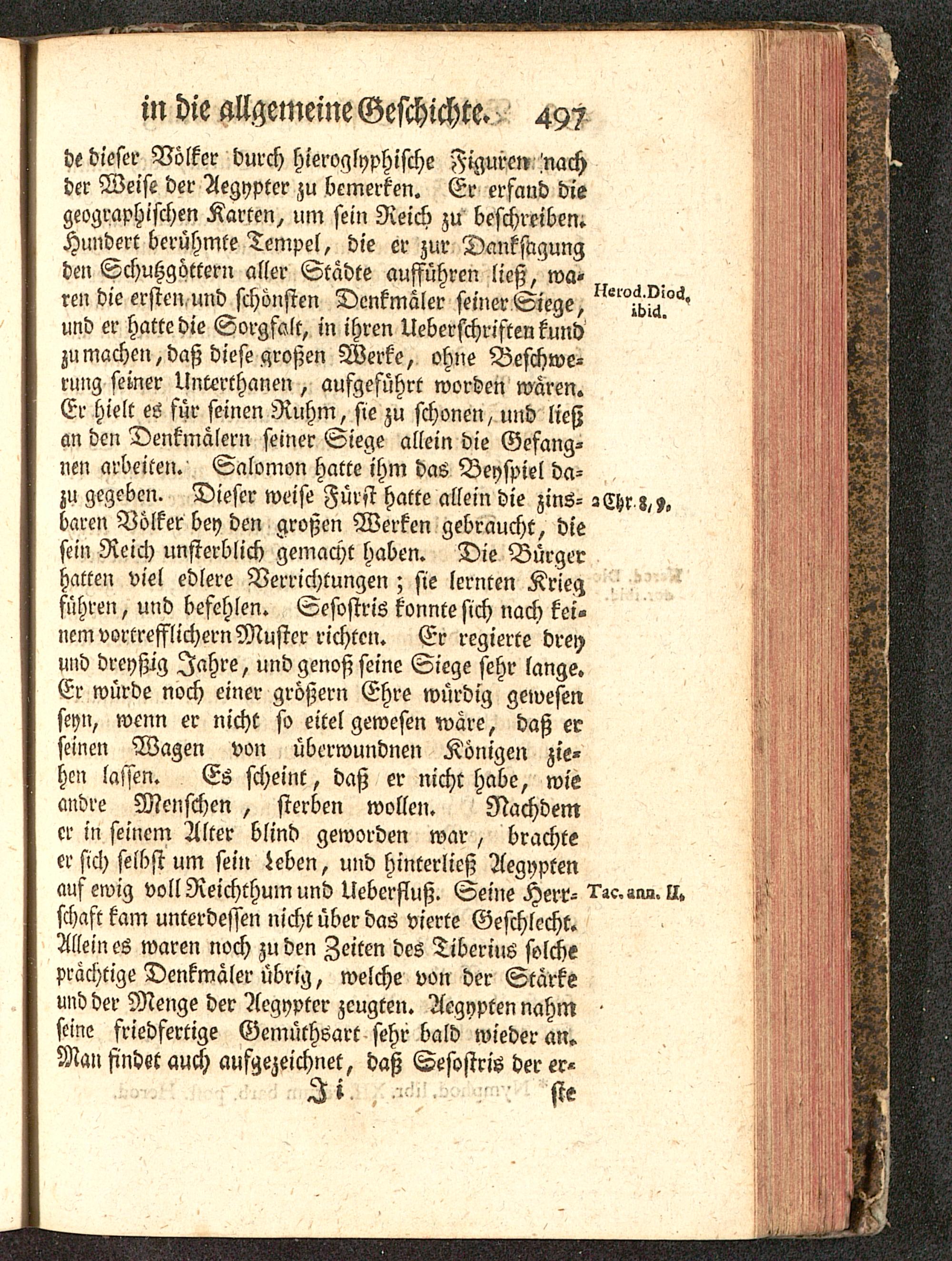 de dieser Völker durch hieroglyphische Figuren'nachder Weise der Aegypter zu bemerken. Er erfand diegeographischen Karten, um sein Reich zu beschreiben»Hundert berühmte Tempel, die er zur Danksagungden Schutzgöttern aller Städte aufführen ließ, wa-^ ^^.ren die ersten und schönsten Denkmaler seiner Siege, ^b^'und er hatte die Sorgfalt, in ihren Überschriften kundzumachen,daß diese großen Werke, ohne Beschwe-rung semer Unterthanen, aufgeführt worden wären.Er hielt eö für seinen Ruhm, sie zu schonen, und ließan den Denkmälern seiner Siege allein die Gefang-nen arbeiten. Salomon hatte ihm das Beyspiel da- ,,zu gegeben. Dieser weise Fürst hatte allein die zins- -Chr z,?baren Völker bey den großen Werken gebraucht, diesein Reich unsterblich gemacht haben. Die Bürgerhatten viel edlere Verrichtungen; sie lernten Kriegführen, und befehlen. Sesostris konnte sich nach kei-nem vortrefflichern Muster richten. Er regierte dreyund dreyßig Jahre, und genoß seine Siege sehr lange.Er würde noch einer größern Ehre würdig gewesenseyn, wenn er nicht so eitel gewesen wäre, daß erseinen Wagen von überwundnen Königen zie-hen lassen. Es scheint, daß er nicht habe, wieandre Menschen, sterben wollen. Nachdemer in seinem Alter blind geworden war , brachteer sich selbst um sein Leben, und hinterließ Aegypten auf ewig voll Reichthum und Ueberfluß. Seine Herr- i'ac.smi.schaft kam unterdessen nicht über das vierte Geschlecht.Allein es waren noch zu den Zeiten des Tiberius solcheprächtige Denkmäler übrig, welche von der Stärkeund der Menge der Aegypter zeugten. Aegypten nahm -seine friedfertige Gemüthsart sehr bald wieder an.Man findet auch aufgezeichnet, daß Sesostris der er-