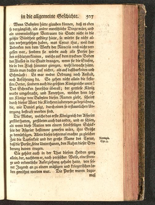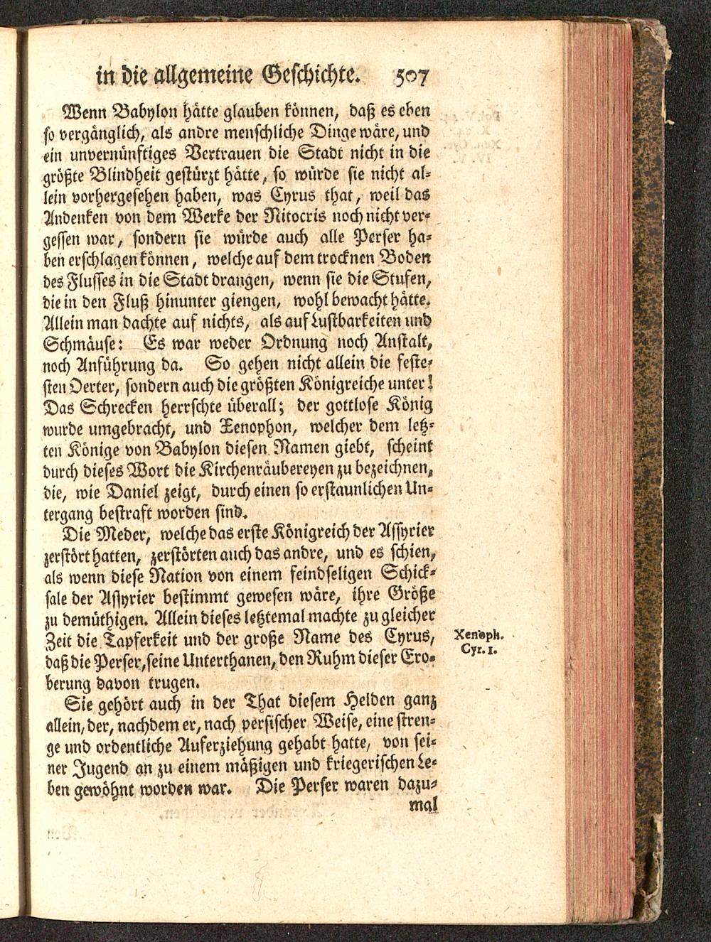 Wenn Babylon hatte glauben können, daß es ebenso vergänglich, als andre menschliche Dinge wäre, undein unvernünftiges Vertrauen die Stadt nicht in diegrößte Blindheit gestürzt hatte, so würde sie nicht al-lein vorhergesehen haben, was Cyrus that, weil dasAndenken von dem Werke der Nitocris noch nicht ver-gessen war, sondern sie würde auch alle Perser ha-ben erschlagen können, welche auf dem trocknen Bodendes Flusses in die Stadt drangen, wenn sie die Stufen,die in den Fluß hinunter giengen, wohl bewacht hätte.Allein man dachte auf nichts, als aufLustbarkciten undSchmäuse: Es war weder Ordnung noch Anstalt,noch Anführung da. So gehen nicht allein die feste-sten Oerter, sondern auch die größten Königreiche unter!Das Schrecken herrschte überall; der gottlose Königwurde umgebracht, und Tenophon, welcher dem letz-ten Könige von Babylon diesen Namen giebt, scheintdurch dieses Wort dieKirchenraubereyen zu bezeichnen,die, wie Daniel zeigt, durch einen so erstaunlichen Un-tergang bestraft worden sind.