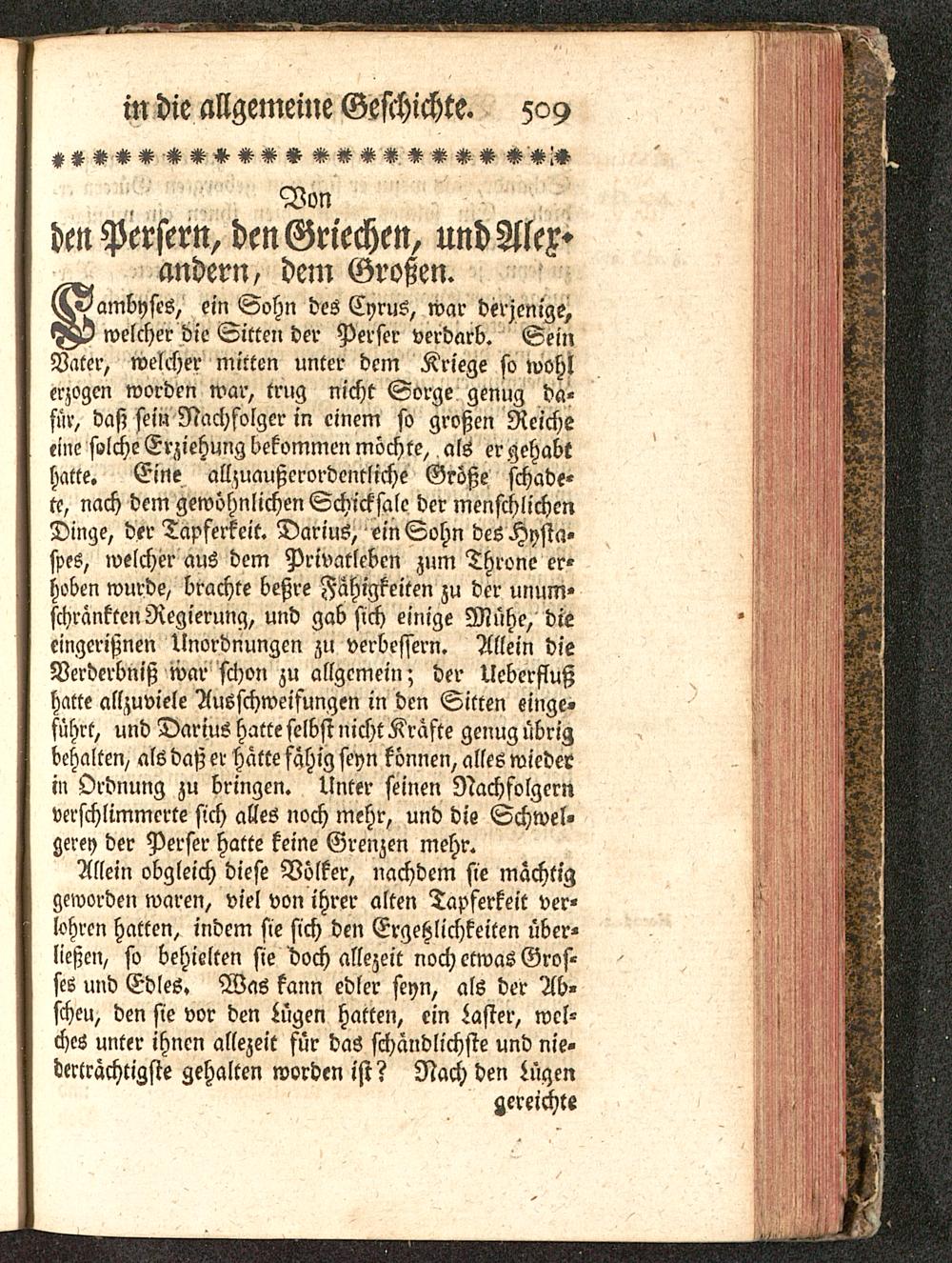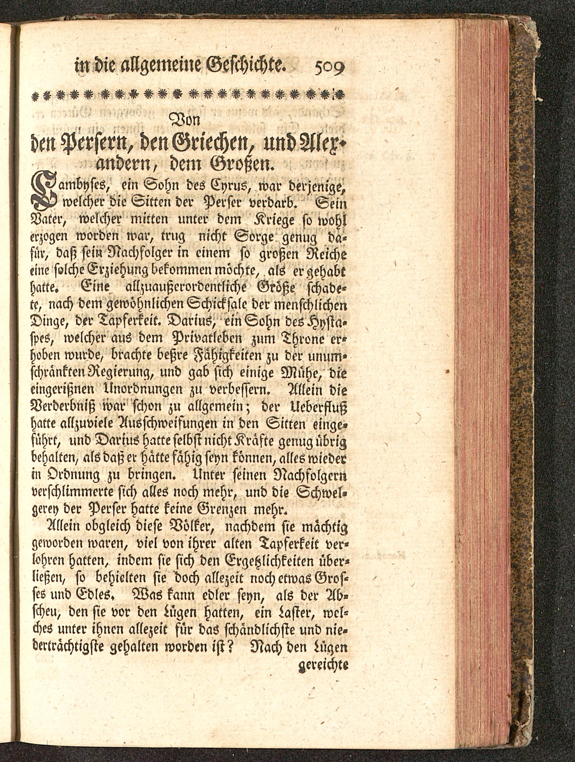 (jAambyscs, ein Sohn des Cyrus, war derjenige,welcher die Sitten der Perser verdarb. SeinVater, welcher mitten unter dem Kriege so wohlerzogen worden war, trug nicht Sorge genug da-für, daß sein Nachfolger in einem so großen Reichekinc solche Erziehung bekommen möchte, als er gehabthatte. Eine allzuaußcrordentliche Größe schade«te, nach dem gewöhnlichen Schicksale der menschlichenDinge, der Tapferkeit. Darius, ein Sohn des Hysta-spes, welcher aus dem Privatleben zum Throne er-hoben wurde, brachte beßre Fähigkeiten zu der unum-schränkten Regierung, und gab sich einige Muhe/dieeingcrißnen Unordnungen zu verbessern. Allein dieVerderbniß war schon zu allgemein; der Ueberflußhatte allzuviele Ausschweifungen in den Sitten einge-führt, und Darius hatte selbst nicht Kräfte genug übrigbehalten, als daß er hätte fähig seyn können, alles wiederin Ordnung zu bringen. Unter seinen Nachfolgernverschlimmerte sich alles noch mehr, und die Schwel-gerey der Perser hatte keine Grenzen mehr.
