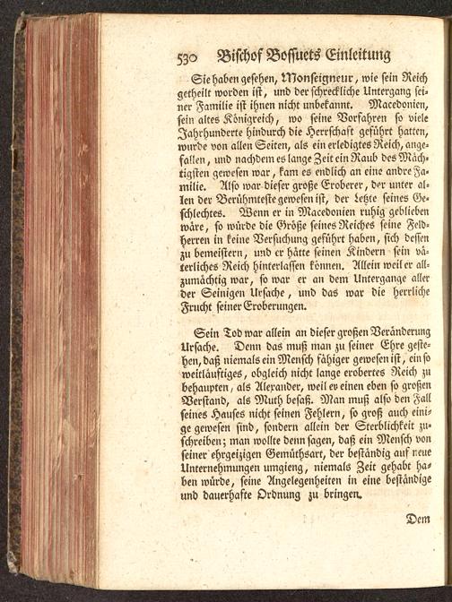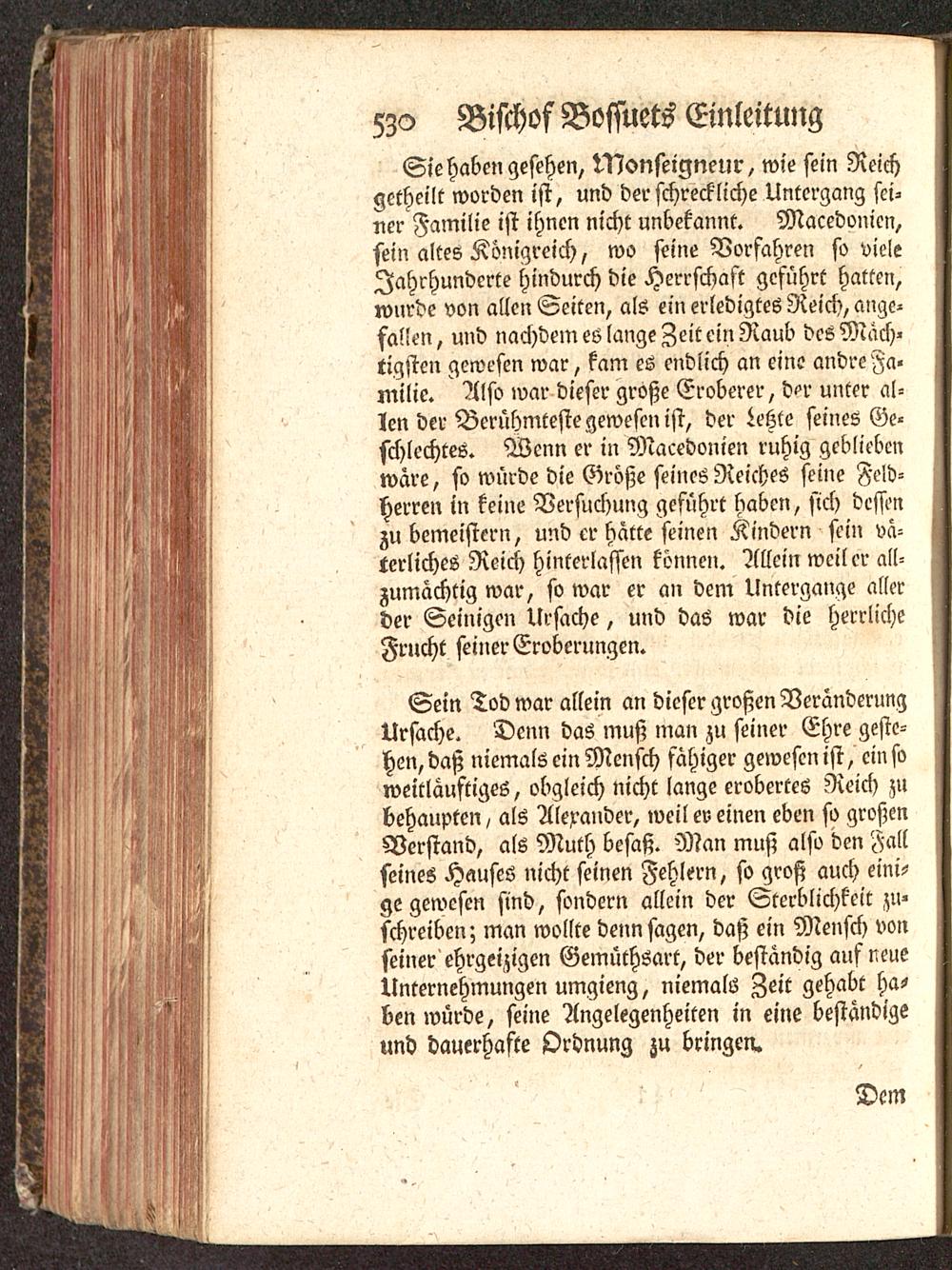 Sie haben gesehen, Nlonseigneur, wie sein Reichgetheilt worden ist , und der schreckliche Untergang sei-ner Familie ist ihnen nicht unbekannt. Macedouien,sein altes Königreich, wo seine Vorfahren so vieleJahrhunderte hindurch die Herrschast geführt hatten,wurde von allen Seiten, als ein erledigtes Reich, ange-fallen, und nachdem es lange Zeit ein Raub des Mäch-tigsten gewesen war, kam es endlich an eine andre Fa-milie. Also war dieser große Eroberer, d->r unter al-len der Berühmteste gewesen ist, der Letzte seines Ge-schlechtes. Wenn er in Macedonien ruhig gebliebenwäre, so würde die Größe seines Reiches seine Feld-herren in keine Versuchung geführt haben, sich dessenzu bemeistcrn, und er hatte seinen Kindern sein vä-terliches Reich hinterlassen können. Allein weil er all-zumächtig war, so war er an dem Untergange allerder Seinigen Ursache, und das war die herrlicheFrucht seiner Eroberungen.