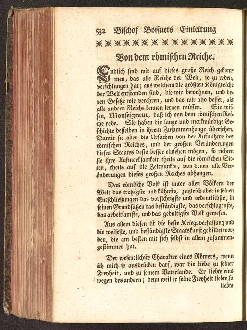 (^^ndlich sind wir auf dieses große Reich gekom-men, das alle Reiche der Welt, so zu reden,verschlungen hat; aus welchem die größten Königreicheder Welt entstanden sind, die mir bewohnen, und de-ren Gesetze wir verehren, und das wir also besser, alsalle andern Reiche kennen lernen müssen. Sie wis-sen, Monseigneur, daß ich von dem römischen Rei-che rede. Sie haben die lange und merkwürdige Ge-schichte desselben in ihrem Zusammenhange übersehen.Damit sie aber die Ursachen von der Aufnahme desrömischen Reiches, und der großen Veränderungendieses Staates desto besser einsehen mögen, so richtensie ihre Aufmerksamkeit theils auf die römischen Sit-ten, theils auf die Zeitpunkte, von denen alle Ver-änderungen dieses großen Reiches abhängen.