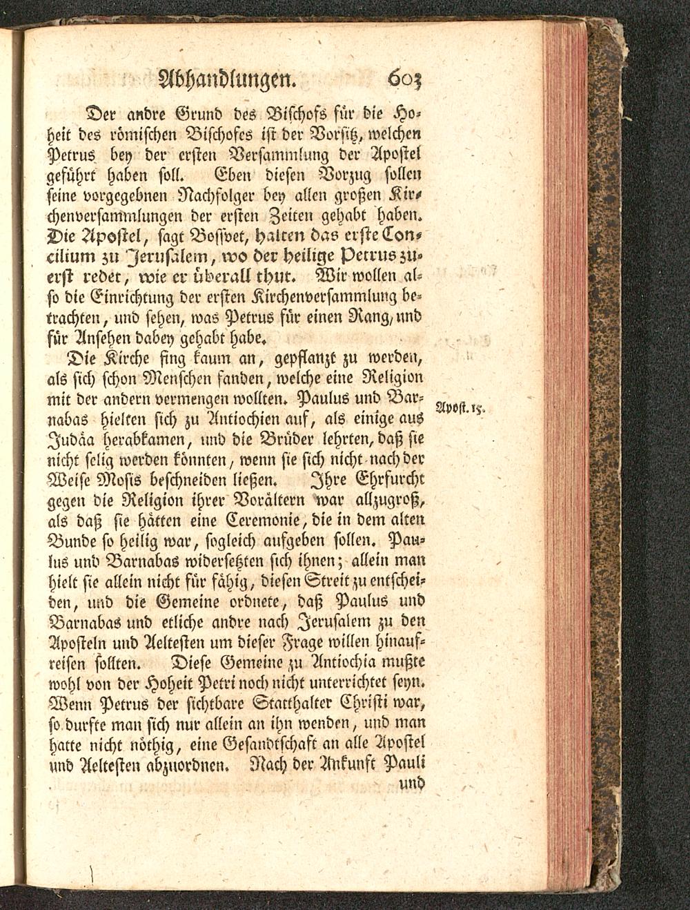 Die Kirche fing kaum an, gepflanzt zu werden,als sich schon Menschen fanden, welche eine Religionmit der andern vermengen wollten. Paulus und Bar-nabas hielten sich zu Antiochien auf, als einige ausJudäa herabkamen, und die Brüder lehrten, daß sienicht selig werden könnten / wenn sie sich nicht nach derWeise Mosis beschneiden ließen. Ihre Ehrfurchtgegen die Religion ihrer Vorältern war allzugroß,als daß sie hatten eine Ceremonie, die in dem altenBunde so heilig war, sogleich aufgeben sollen. Pau-lus und Barnabas widersetzten sich ihnen; allein manhielt sie allein nicht für fähig, diesen Streit zu entschei-den, und die Gemeine ordnete, daß Paulus undBarnabas und etliche andre nach Jerusalem zu denAposteln und Aeltesten um dieser Frage willen hinauf-reisen sollten. Diese Gemeine zu Antiochia mußtewohl von der Hoheit Petri noch nicht unterrichtet seyn.Wenn Petrus der sichtbare Statthalter Christi war,so durfte man sich nur allein an ihn wenden, und manhatte nicht nöthig, eine Gesandtschaft an alle Apostelund Aeltesten abzuordnen. Nach der Ankunft Pauli