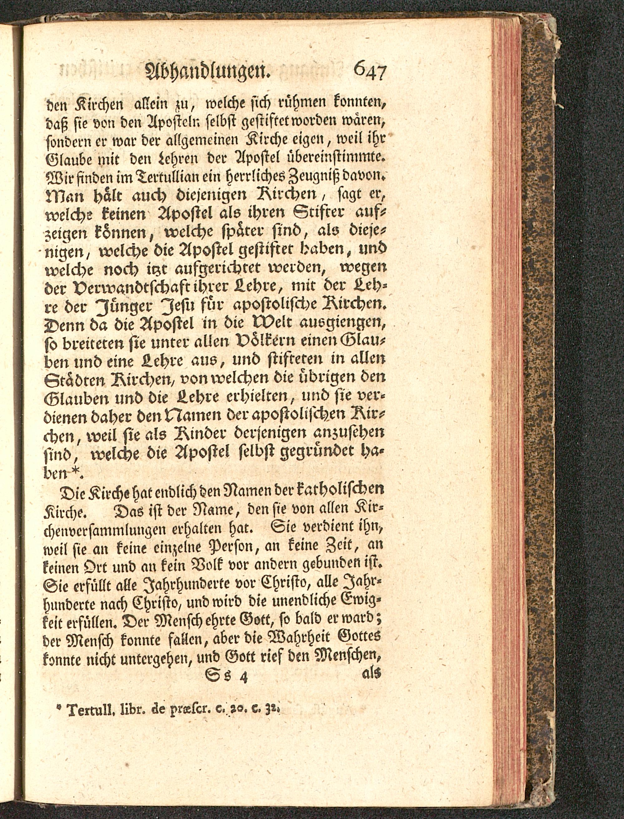 den Kirchen allein zu, welche sich rühmen konnten,daß sie von den Aposteln selbst gestiftet worden wären,sondern er war der allgemeinen Kirche eigen, weil ihrGlaube mit den Lehren der Apostel übereinstimmte.Wir finden im Tertullian ein herrliches Zeugniß davon.Man halt auch diejenigen Zxirchen, sagt er,welche keinen Apostel als ihren Stifter auf-zeigen können, welche später sind, als dieje-nigen, welche die Apostel gestiftet haben, undwelche noch iyc aufgerichtet werden, wegender Verwandtschaft ihrer Lehre, mit der Leh-re der Jünger Jesu für apostolische Rirchen.Denn da die Apostel in die tVelt auogiengen,so breiteren sie unter allen Völkern einen Glau-ben und eine Lehre aus, und stifteten in allenStädten Zxirchen, von welchen die übrigen denGlauben und die Lehre erhielten, und sie ver-dienen daher den Namen der apostolischen Rir-chen, weil sie als Rinder derjenigen anzusehensind, welche die Apostel selbst gegründet ha-ben