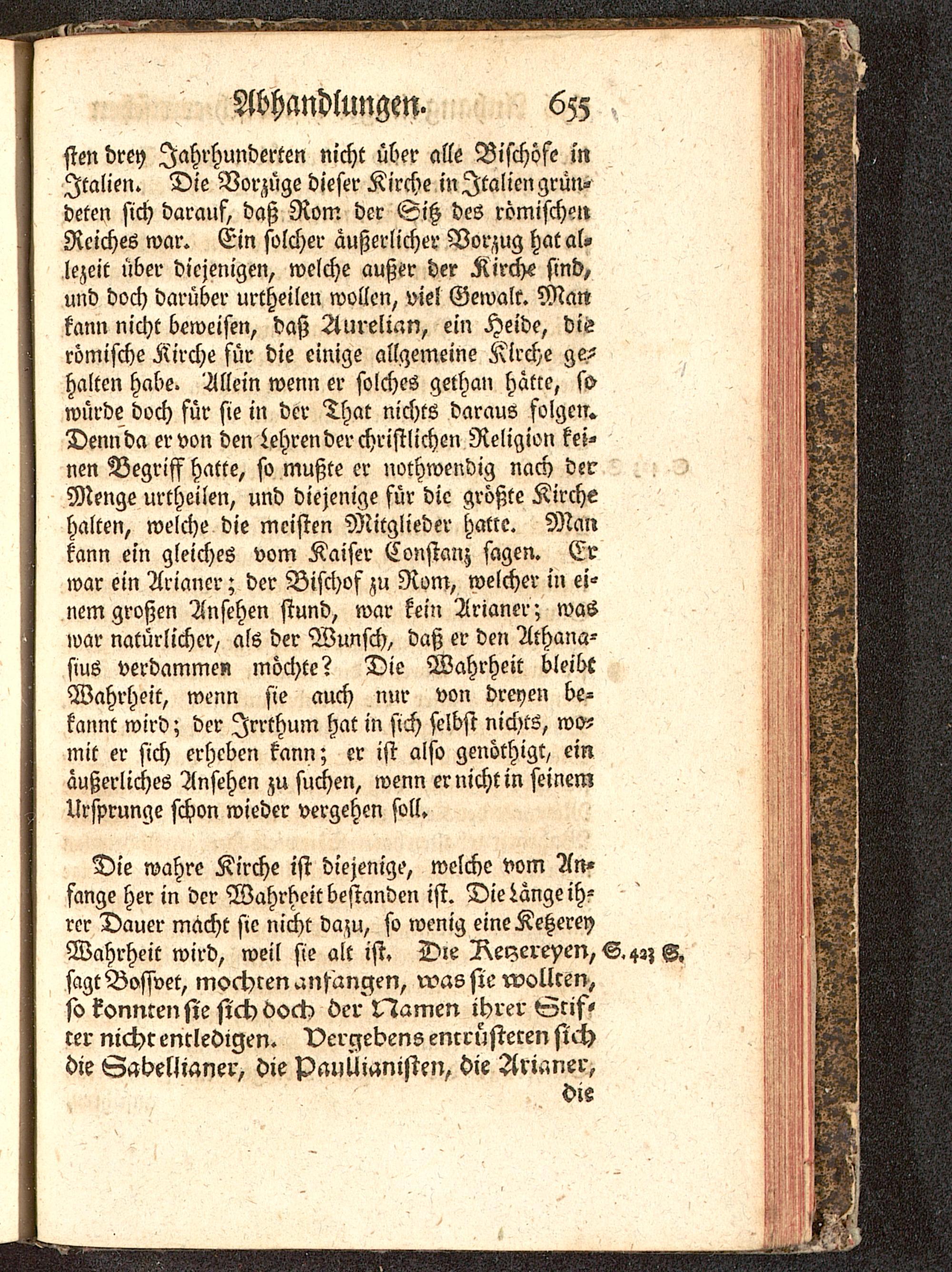Die wahre Kirche ist diejenige, welche vom An-fange her in der Wahrheit bestanden ist. Die Länge ih-rer Dauer macht sie nicht dazu, so wenig eineKeHereyWahrheit wird, weil sie alt ist. Die Reyereyen, S. 4,; S.sagt Bossvet, mochten anfangen, roas sie wollten,so konnten sie sich dock der Namen ihrer Srif«rer nicht entledigen. Vergebens enrrüsieren sichdie Sabelltaner, die pauüianisten, die Aricmer,