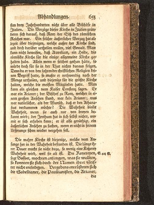 sten drey Jahrhunderten nicht über olle Bischöfe inItalien. Die Vorzüge dieser Kirche in Italien grün-deten sich darauf, daß Rom der Sitz des römisch?»Reiches war. Ein solcher äußerlicher Vorzug hat al,lezeit über diejenigen, welche außer der Kirche sind,und doch darüber urtheilen wollen, viel Gewalt. Mankann nicht beweisen, daß Aurelmn, ein Heide, dierömische Kirche für die einige allgemeine Kirche ge-halten habe. Allein wenn er solches gethan hätte, sowürde doch für sie in der That nichts daraus folgen.Dennda er von den Lehrender christlichen Religion kei-nen Begriff hatte, so mußte er nothwendig nach derMenge urtheilen, und diejenige für die größte Kirchehalten, welche die meisten Mitglieder hatte. Mankann ein gleiches vom Kaiser Constanz sagen. Erwar ein Arianer; der Bischof zu Rom , welcher in ei-nem großen Ansehen stund, war kein Arianer; waswar natürlicher, als der Wunsch, daß er den Athana-sius verdammen möchte? Die Wahrheit bleibeWahrheit, wenn sie auch nur von dreyen be-kannt wird; der Irrthum hat in sich selbst nichts, wo-mit er sich erheben kann; er ist also genöthigt, einäußerliches Ansehen zu suchen, wenn er nicht in seinemUrsprünge schon wieder vergehen soll.